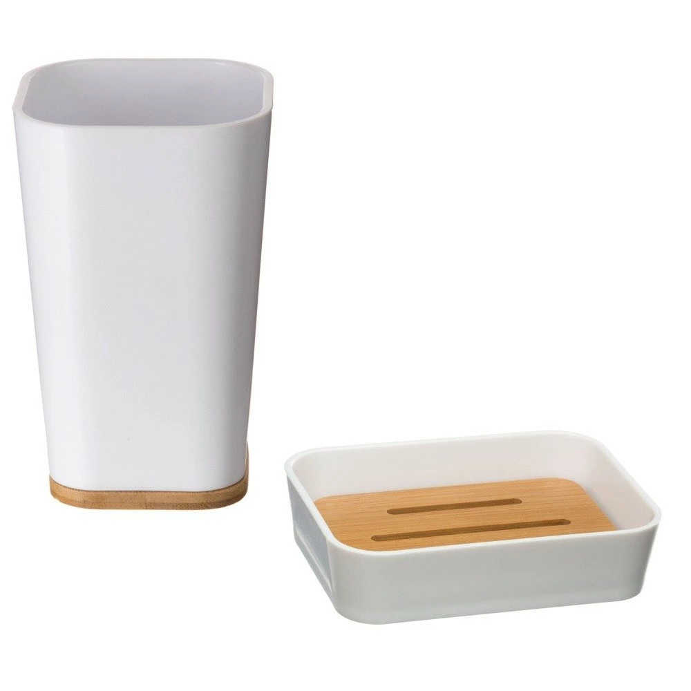 Angesichts der Erwartungen der Kunden kam das Unternehmen 5five Simple Smart heraus. Das von ihr entworfene Badezimmer-Set enthält einen Zahnbürstenbehälter und einen Seifenmacher ist eine Lösung, die die Hygiene und Bequemlichkeit der gespeicherten Dinge garantiert. Das Set besteht aus hochwertigem Polystyrol und Bambusholz. Sein ungewöhnliches Styling ist eine etwas abgerundete Form und eine Kombination aus dem modischsten Weiß und Holz dieser Saison ist eine Lösung, die durch seine Eleganz besticht.