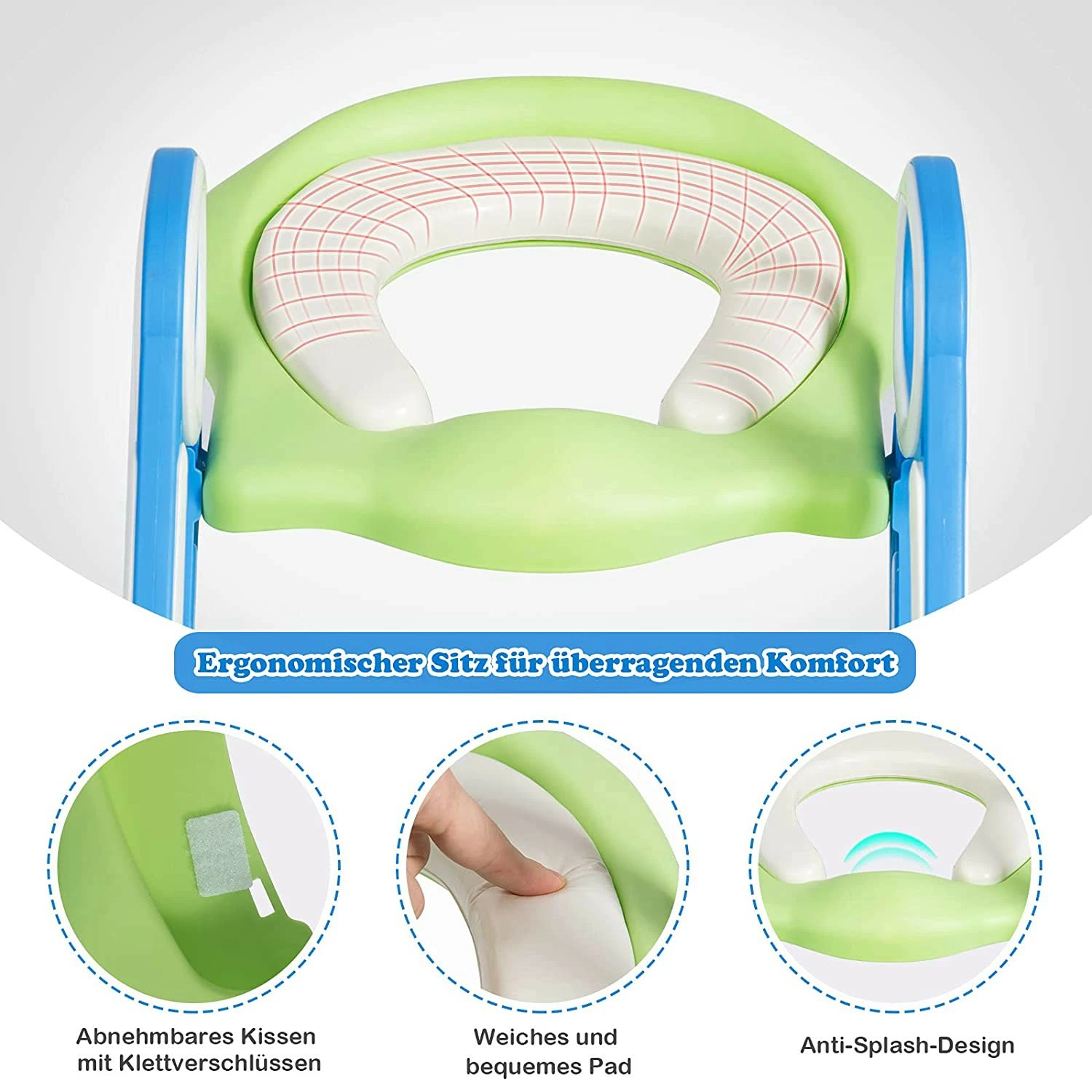 【Kinder Toilettentrainer】 Das süße Design dieses Toiletten-Aufsatzes wird das Interesse Ihres Kindes wecken und so seine Selbstständigkeit fördern. Das abnehmbare, weiche Kissen des Töpfchentrainers schenkt Ihrem Kind eine angenehme Sitzerfahrung und ermutigt so zum eigenständigen Toilettengang. Zusätzlich ermöglicht das spritzwassergeschützte Design eine unbedenkliche und sorgenfreie Nutzung auch von Jungen.