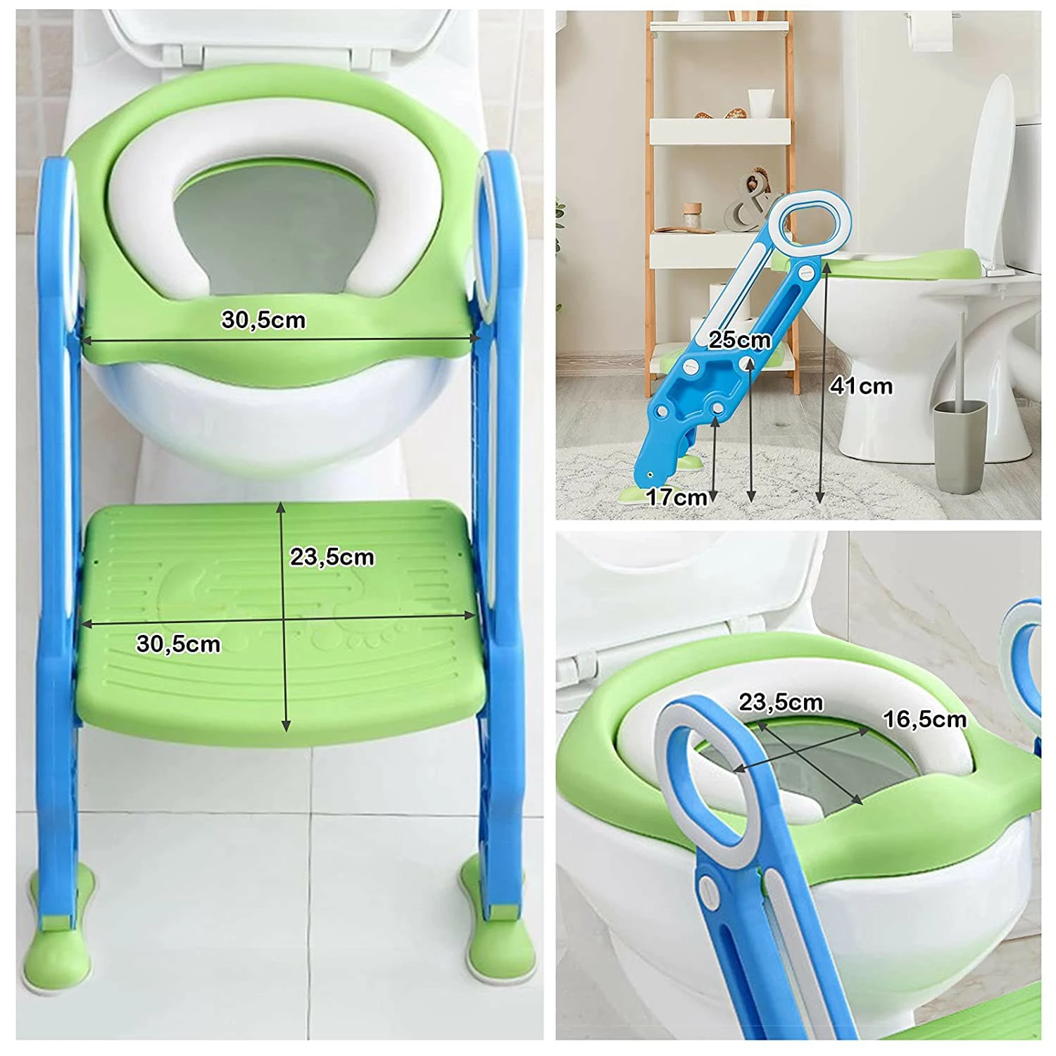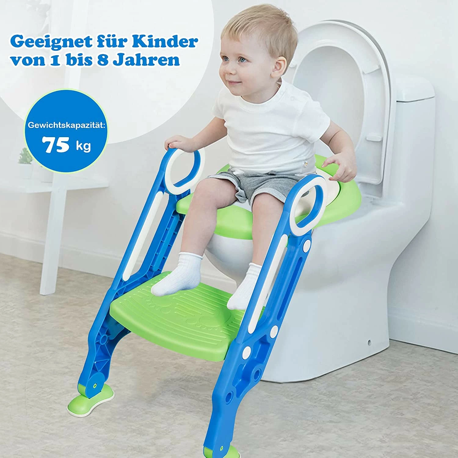 Dieser Toilettentrainer wurde entworfen, um es Kindern zu ermöglichen, selbstständig auf die Toilette zu gehen. Er wird aus hochwertigen Materialien hergestellt und hat daher eine überaus lange Lebensdauer. Das abnehmbare, weiche Kissen um den Sitz fördert die positive Erfahrung Ihres Kindes und wird sein Interesse für eine eigenständige Nutzung fördern. Die Sicherheit Ihres Kindes wird hierbei durch die leicht greifbaren Griffe sowie die breite, rutschsichere Stufe gewährleistet. Die Höhe dieser Stufe kann sogar äußerst einfach und flexibel an die Größe Ihres Kindasst werden. Dank des faltbaren Designs werden Sie den Trainer jederzeit zusammenklappen und zur Seite stellen können und die schönen, bunten Farben werden Ihr Kind täglich dazu motivieren, den Toilettentrainer zu verwenden.