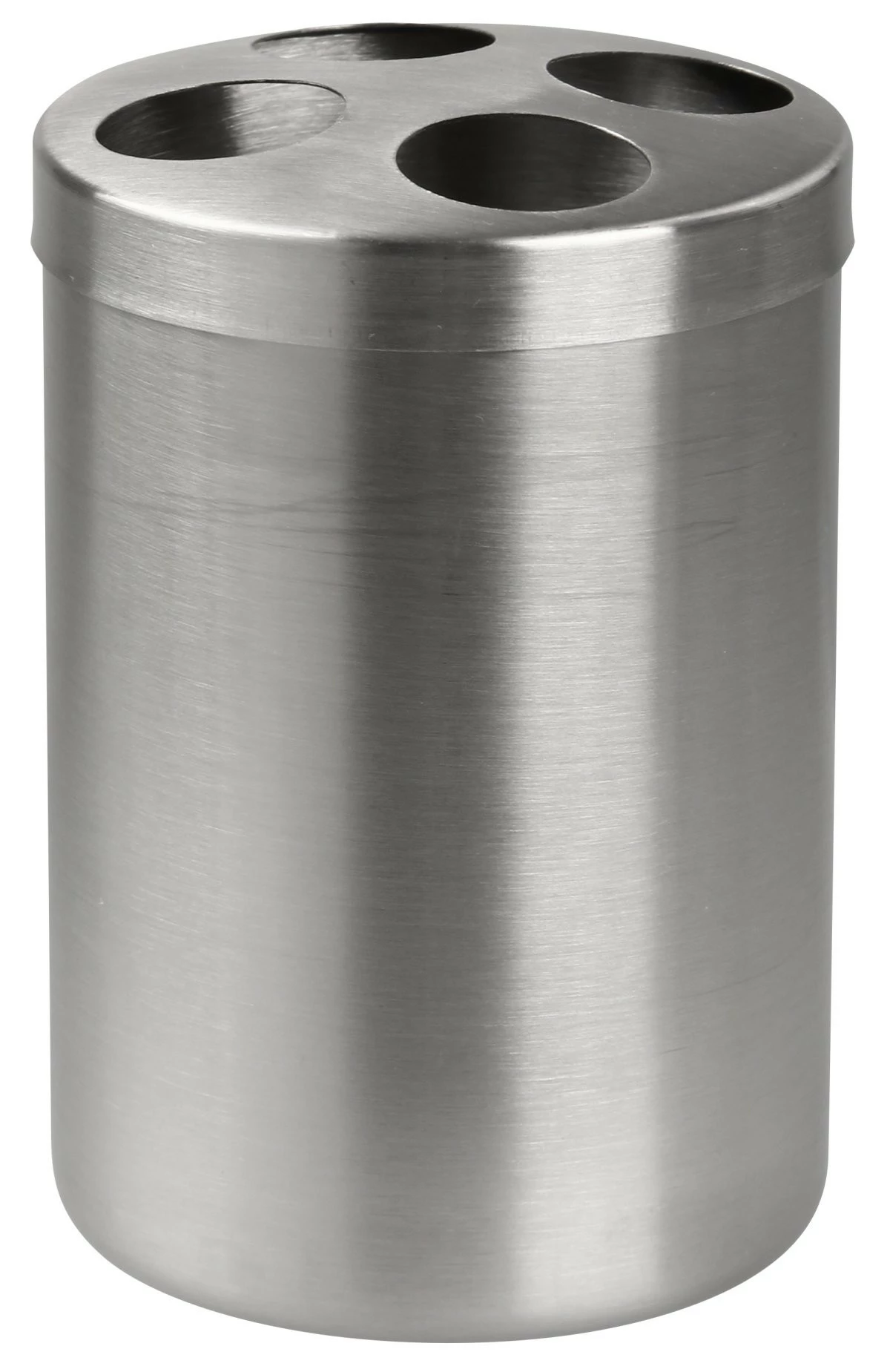 Mit dem Fackelmann Zahnbürstenhalter aus hochwertigem Edelstahl in matter Optik setzen Sie ein optisches Highlight in Ihrem Badezimmer oder Gäste-WC. Der trendige Badbegleiter mit einem Durchmesser von circa 6,5 Zentimetern bietet Platz für bis zu vier Zahnbürsten gleichzeitig, die sich passgenau in die dafür vorgesehenen Öffnungen stecken lassen und so hygienisch trocknen können.