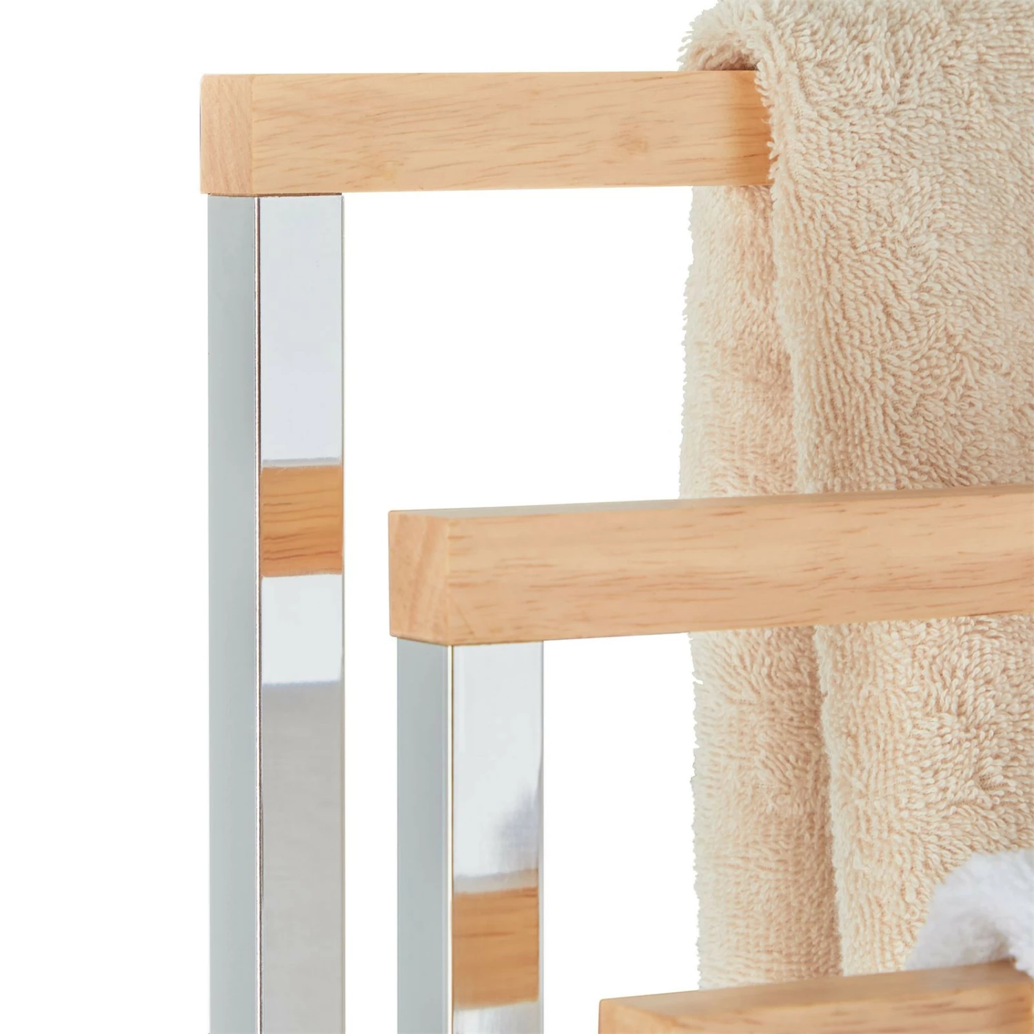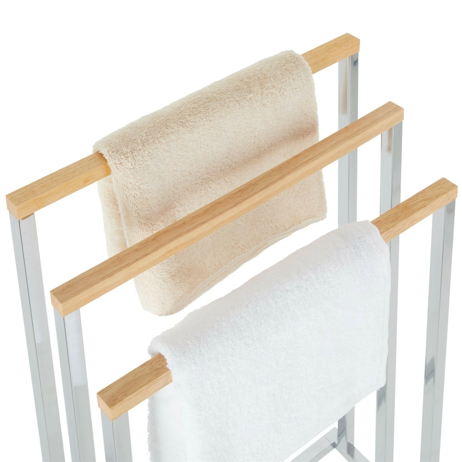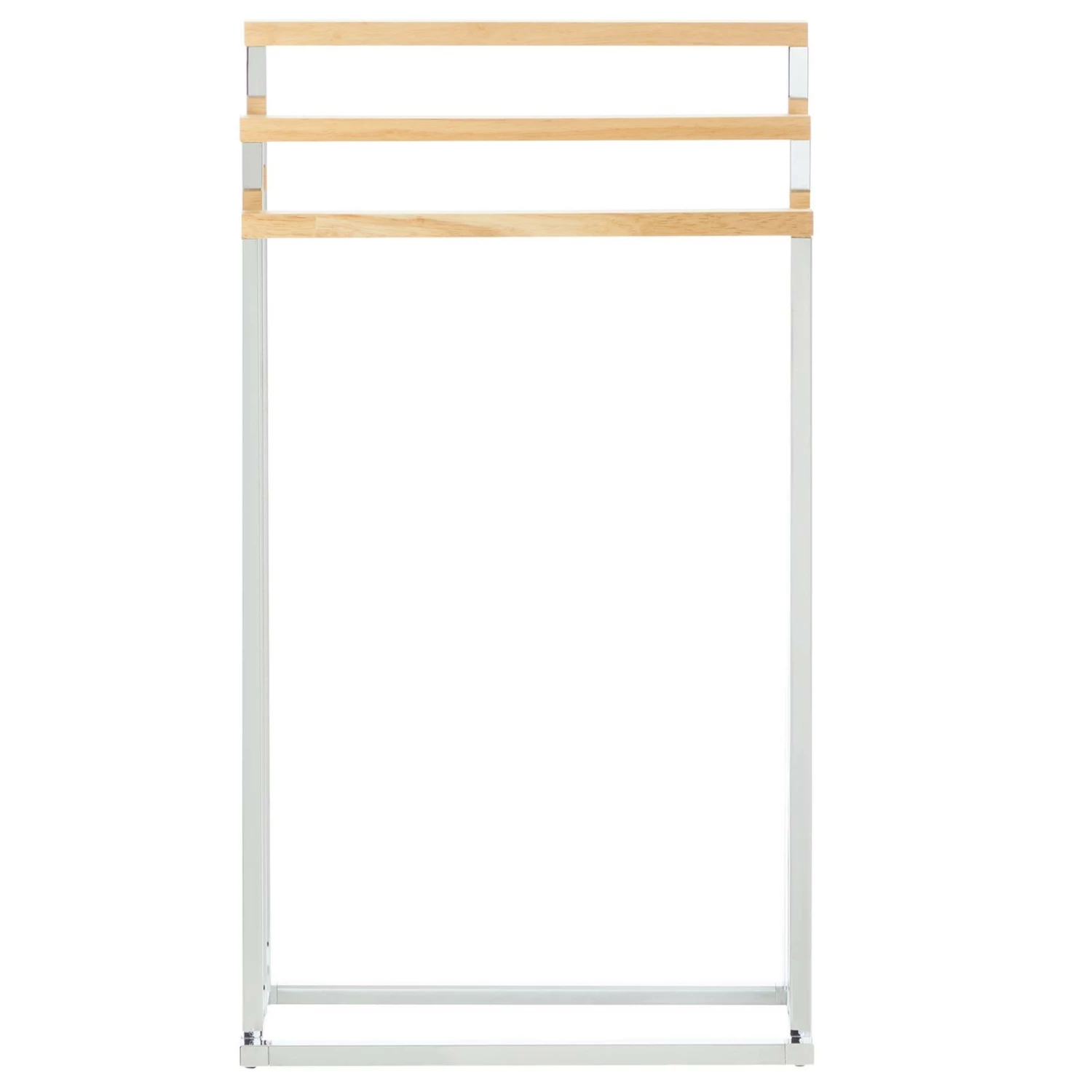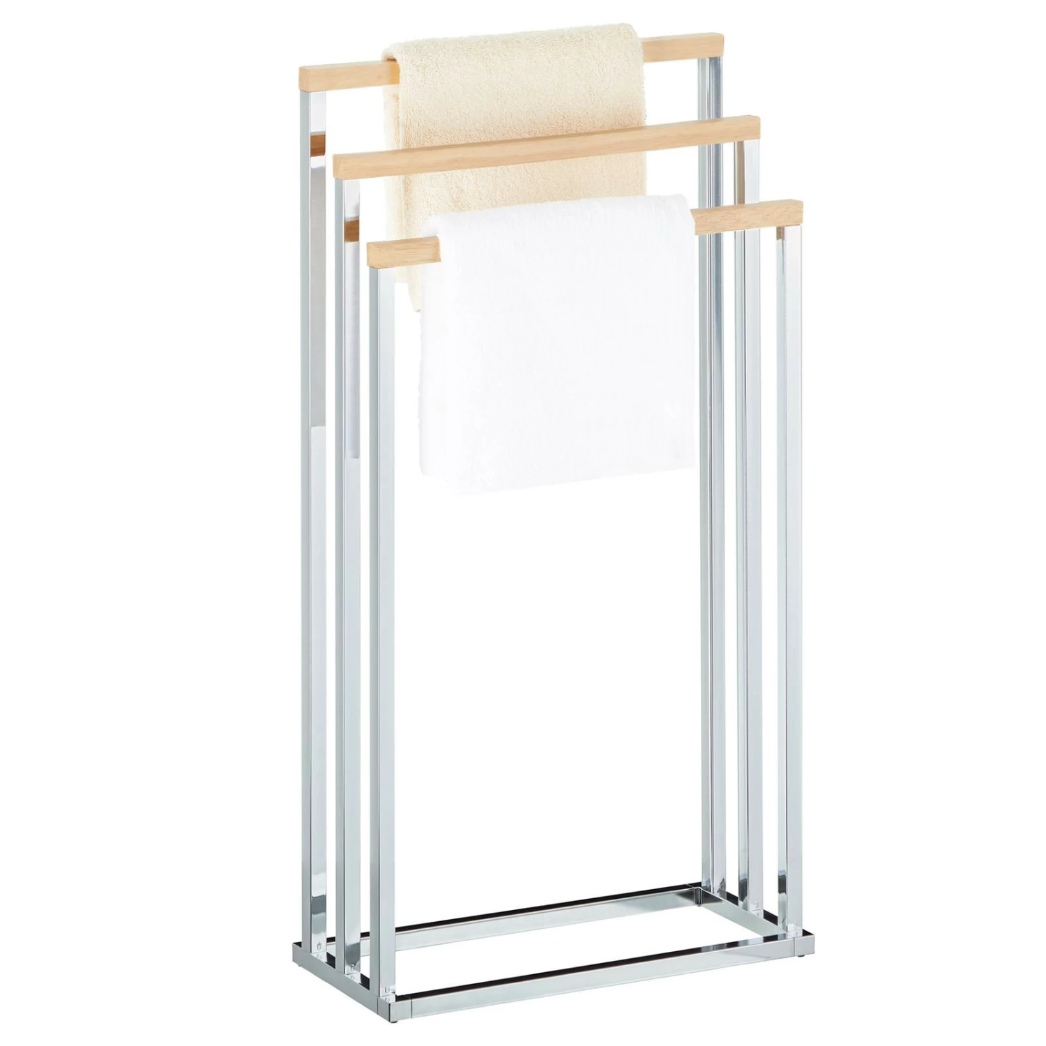 verleiht Ihrem Badezimmer durch die edle Kombination von Holz und Metall das gewisse Etwas. Der gutaussehende Badetuchhalter verfügt für das Trocknen von Ihren Duschtüchern über drei Handtuchstangen. Aufgrund der kompakten Größe ist unser Handtuchständer auch für kleinere Badezimmer optimal geeignet.