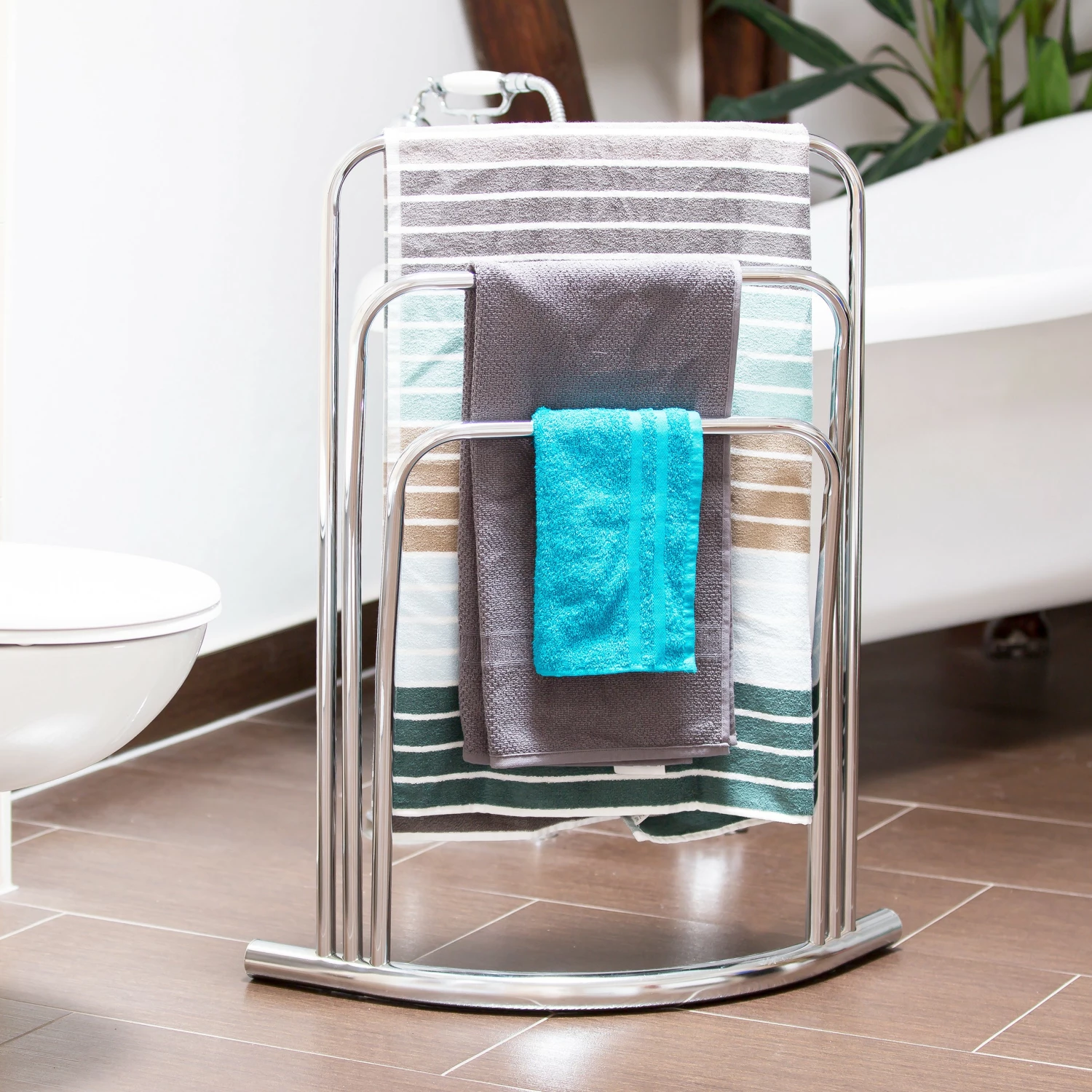 Gerade in kleineren Badezimmern ist häufig wenig Platz, um Handtücher zum Trocknen aufhängen zu können. Eine beliebte Lösung hierfür sind Wandhandtuchhalter. Doch nicht in jeder Wohnung können diese einfach an die Wand montiert werden. Hier schafft dieser Handtuchständer aus der CURVY Kollektion ohne Bohren Abhilfe! Mit seinem großen halbrunden Standfuß steht der Handtuchhalter stabil und kann frei im Raum platziert werden.