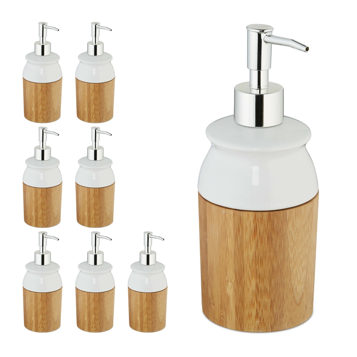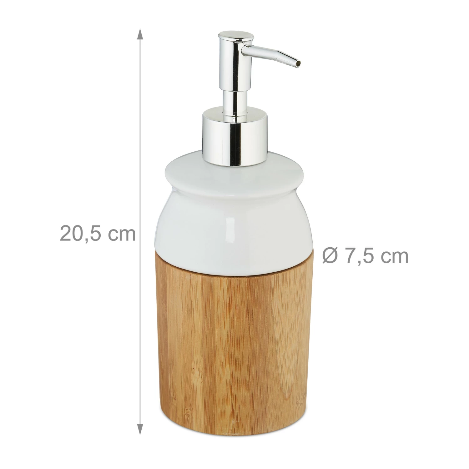 Der praktische Flüssigseifenspender ist nicht nur dekorativ, sondern auch vielseitig einsetzbar. Ob Seife, Lotion, Duschgel, Shampoo oder auch Spülmittel – mit dem Pumpspender lassen sie sich optimal dosieren. Falls der Seifendispenser einmal leer sein sollte, lässt er sich durch Abschrauben der Pumpvorrichtung einfach neu befüllen. Das edle Design aus Bambus, Keramik und einem Pumpkopf in Edelstahl-Optik macht den Seifendosierer zu einem eleganten Accessoire für Bad, WC und Küche.