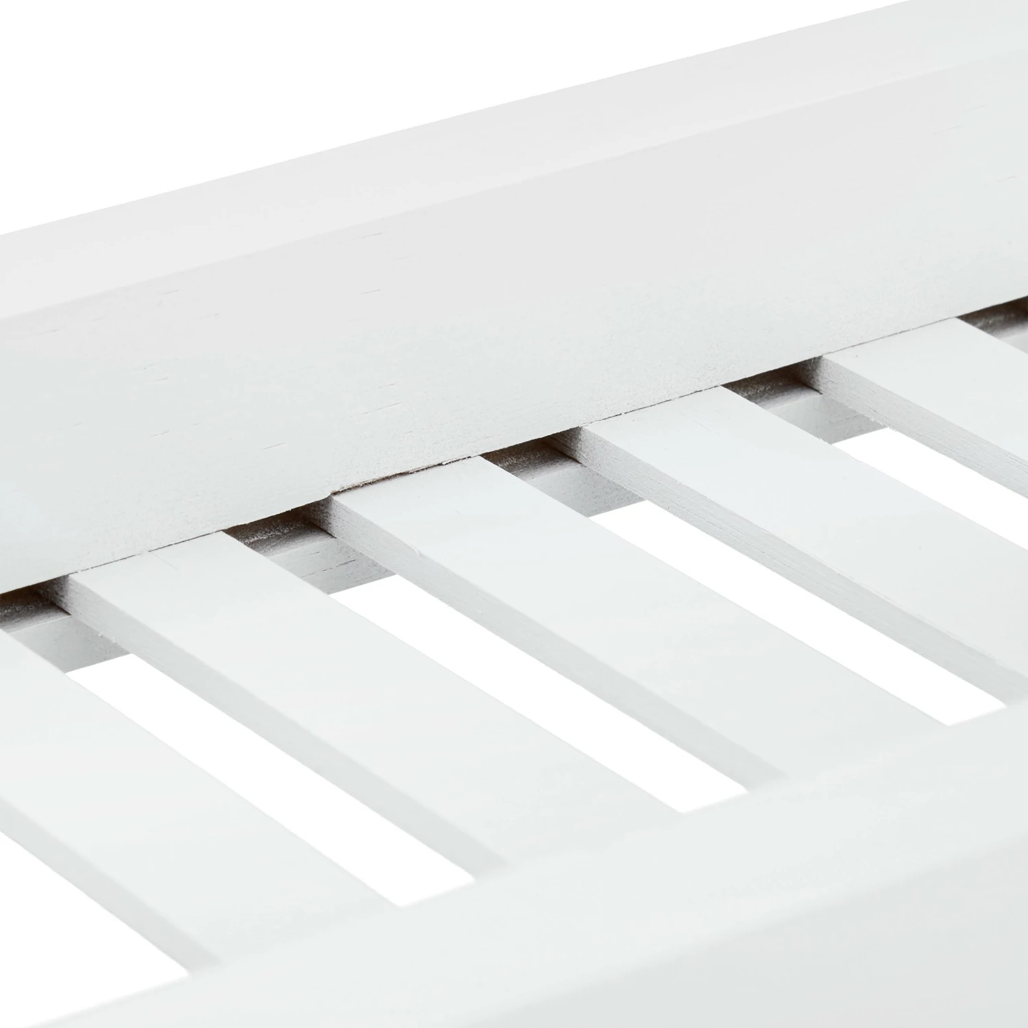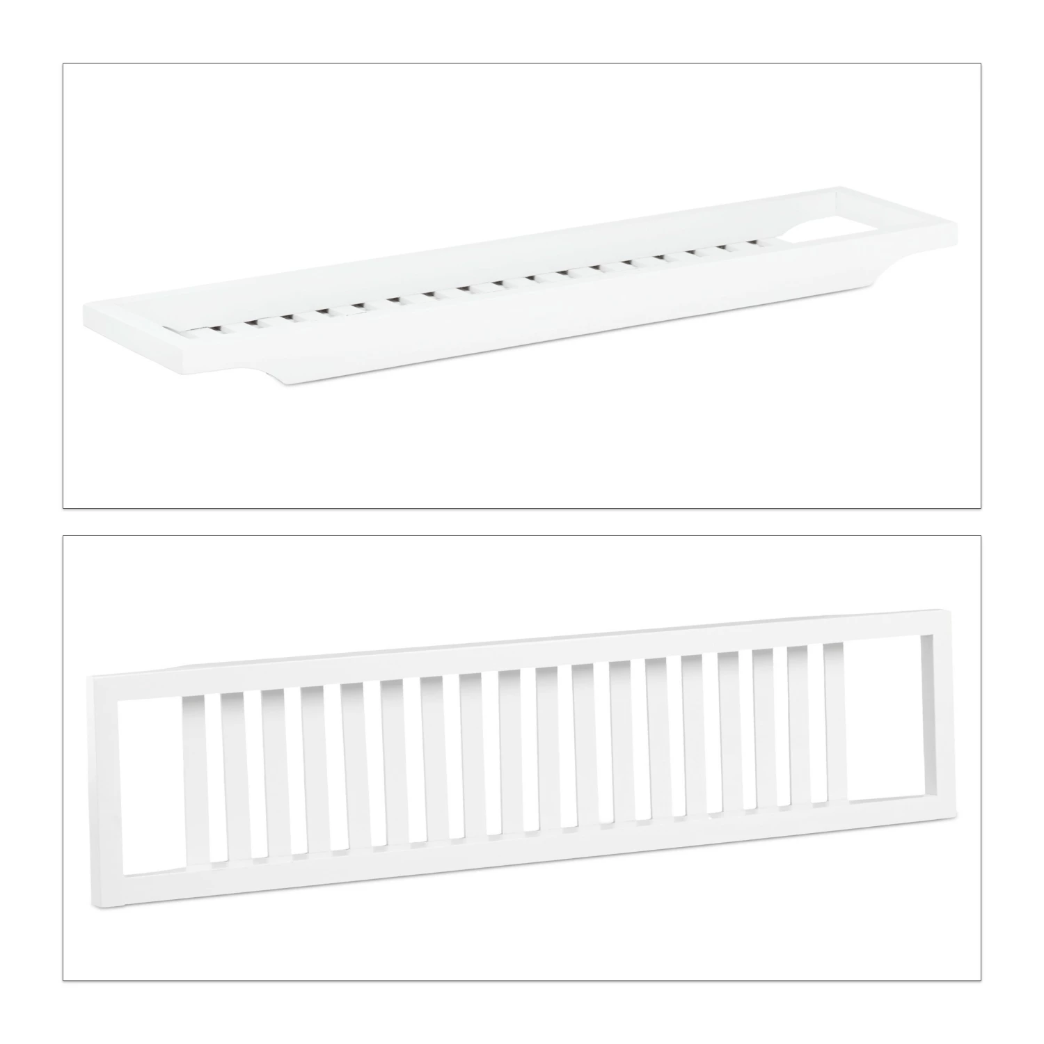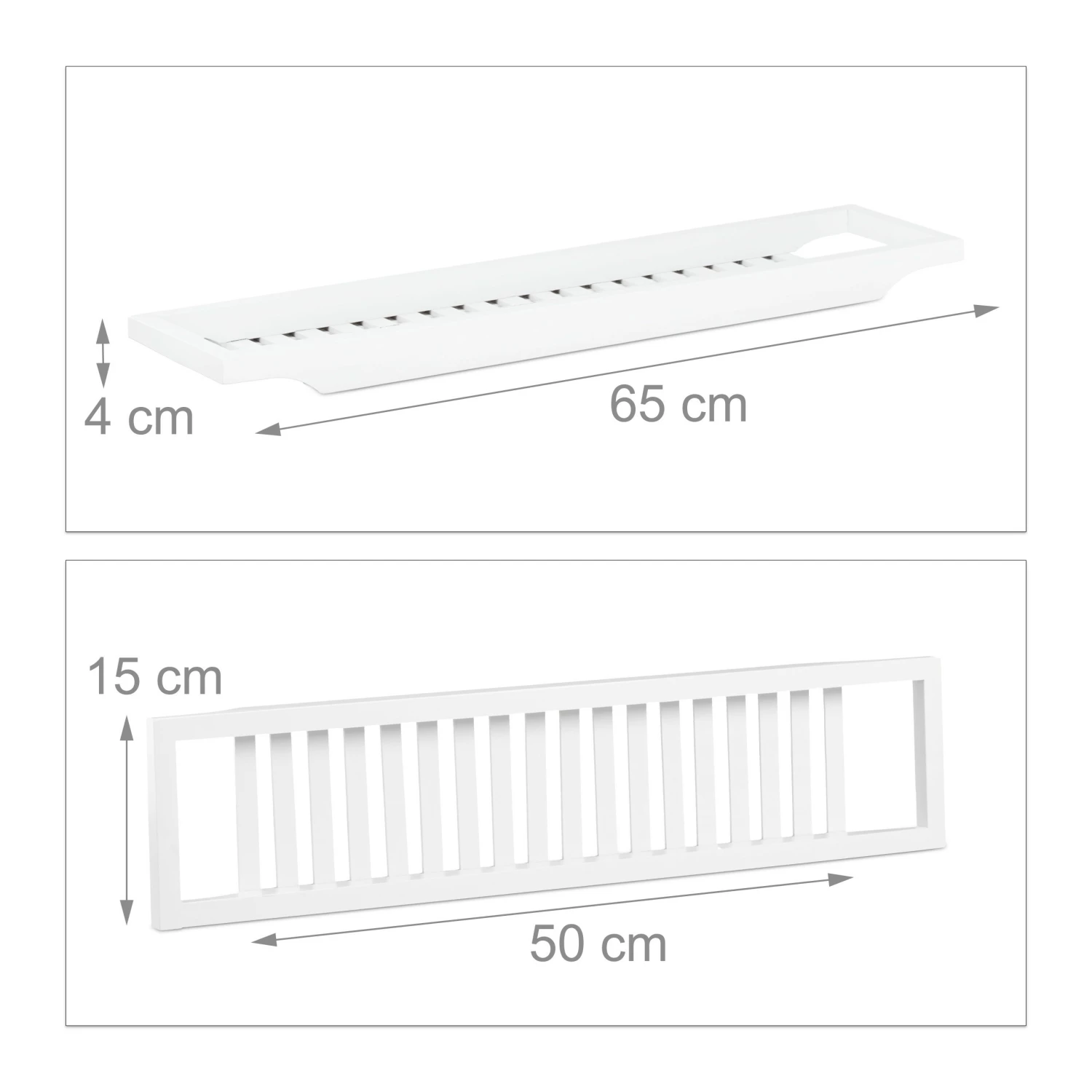Das Badewannenbrett ist für die meisten handelsüblichen Badewannen geeignet. Gewölbte Aussparungen an den Auflageschienen sorgen dafür, dass sich die Ablage dem Wannenrand anpasst und nicht so schnell verrutschen und herunterfallen kann. Auf der Ablagefläche haben Sie ausreichend Platz für Ihre Badutensilien. Die Wannenablage ist aus natürlichem Bambus hergestellt und weiß lackiert. Das Material ist resistent gegen Feuchtigkeit und daher ideal für die Nutzung im Bad geeignet.