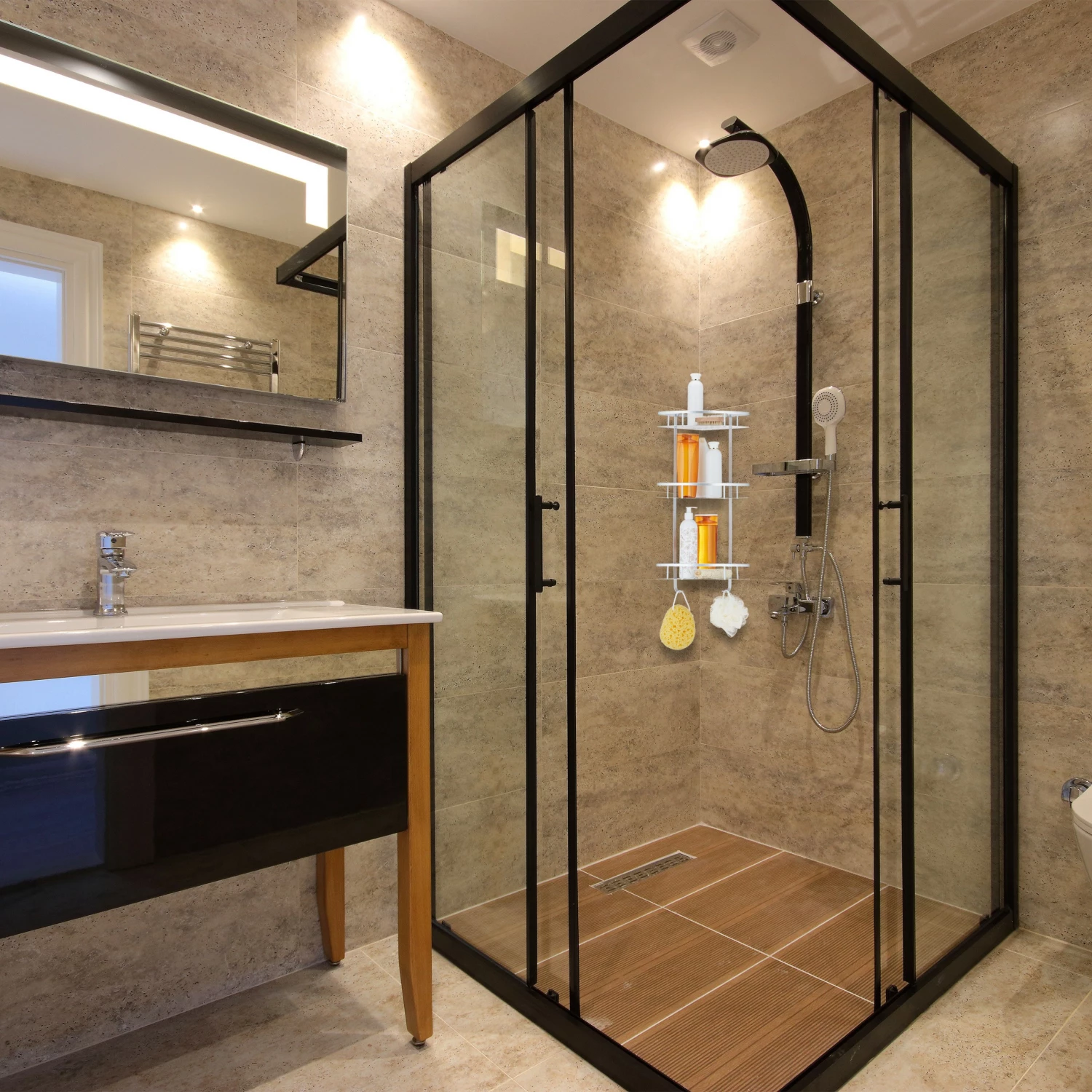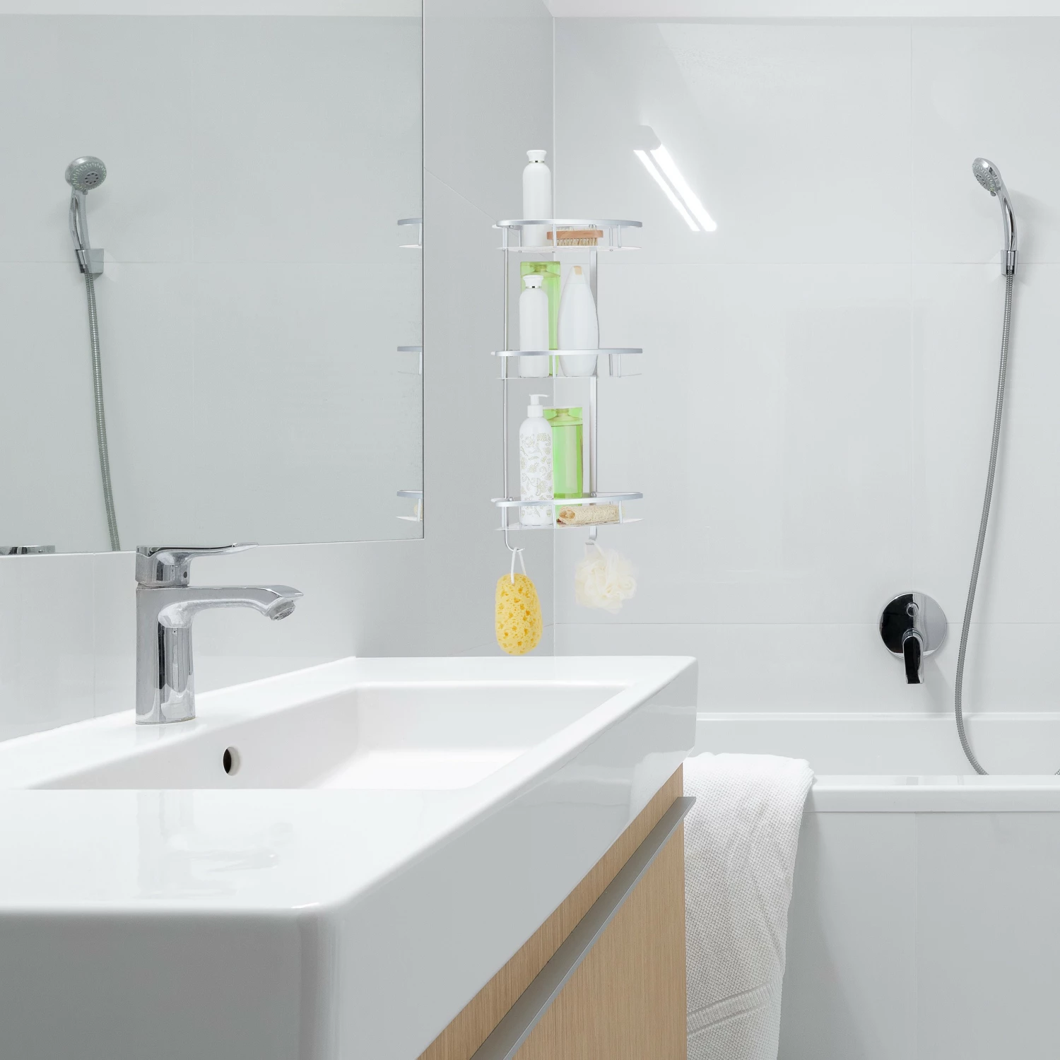 – Wird platzsparend in der Ecke der Duschkabine angebracht