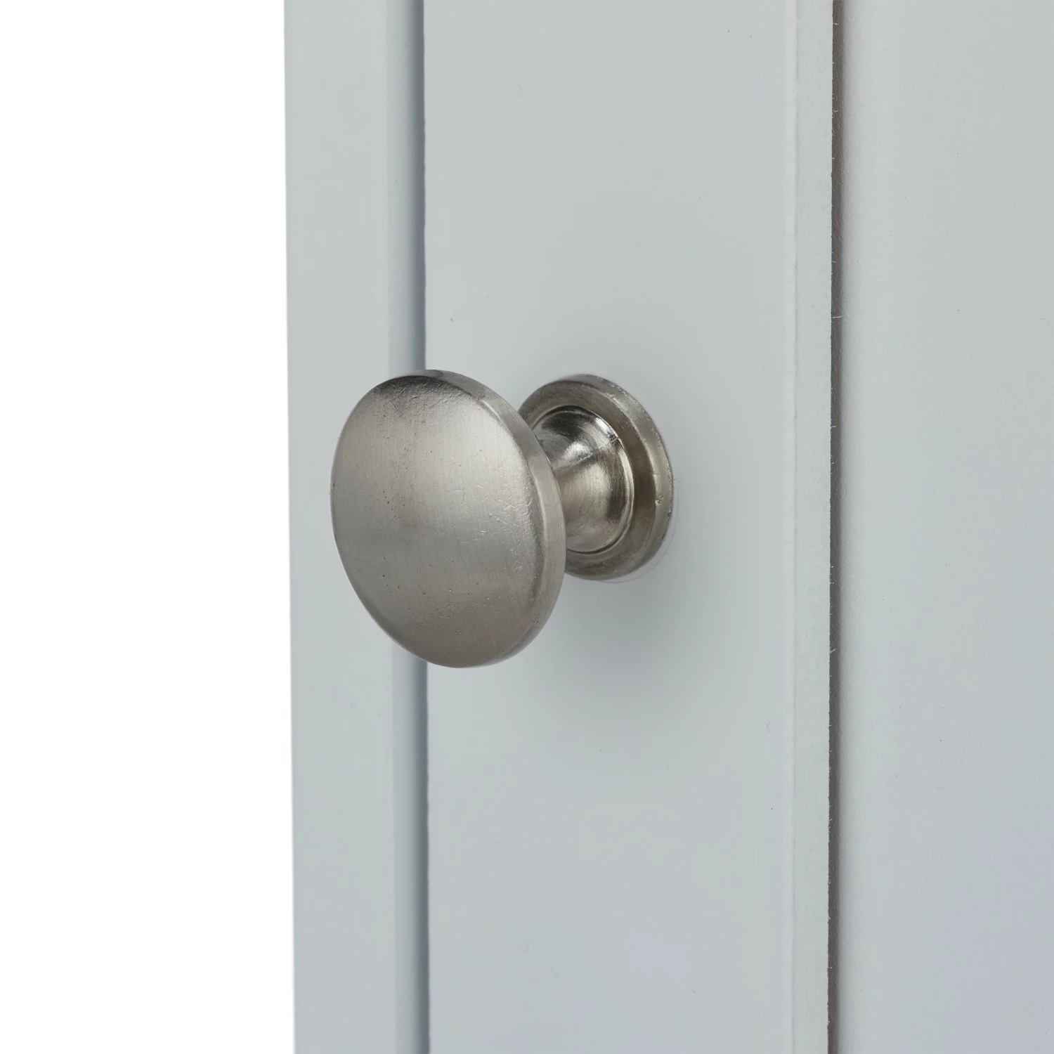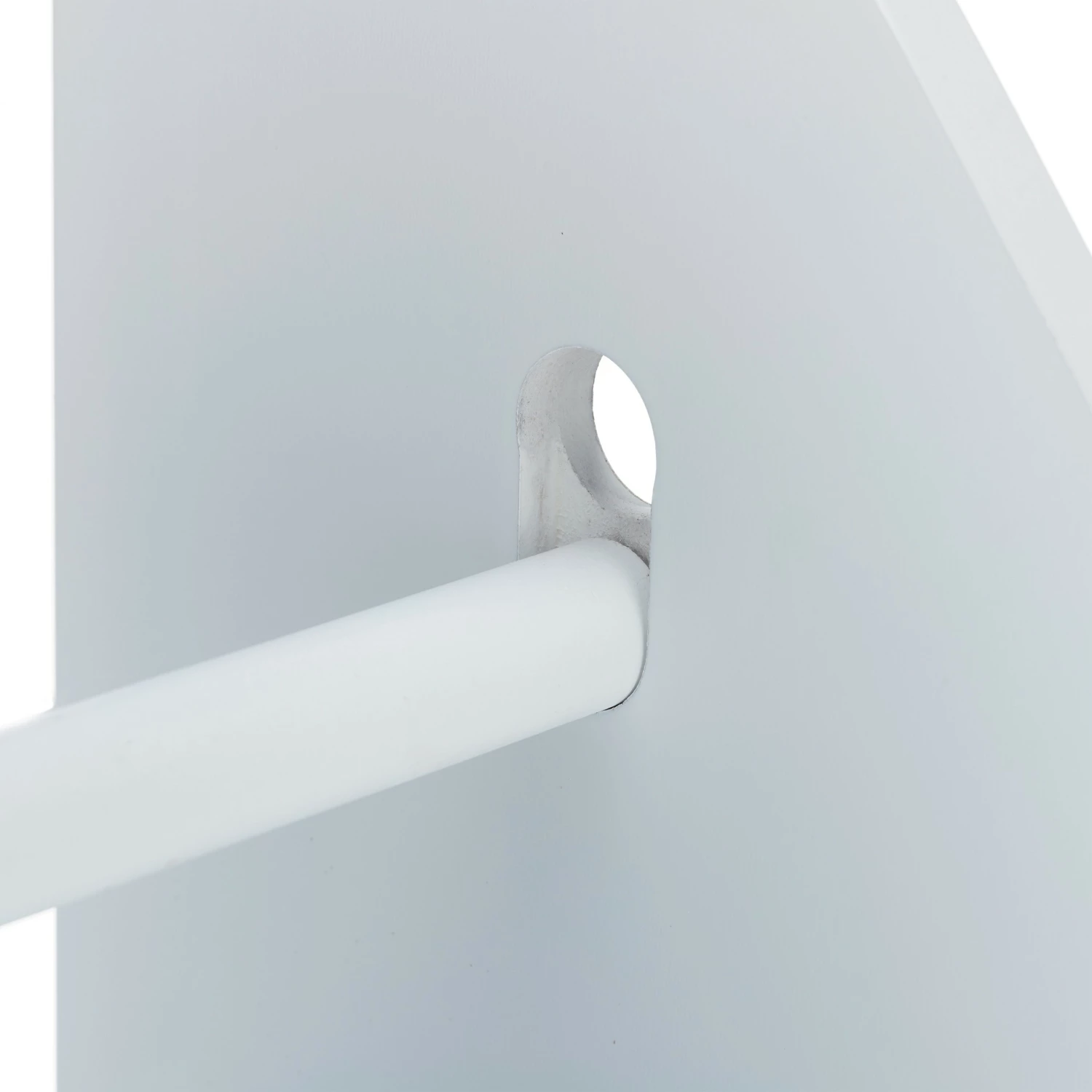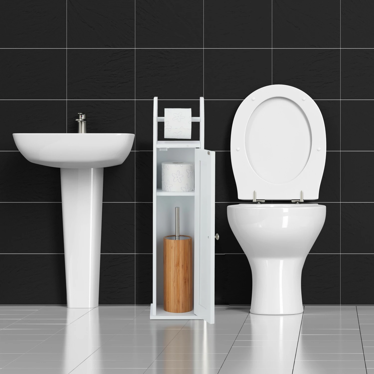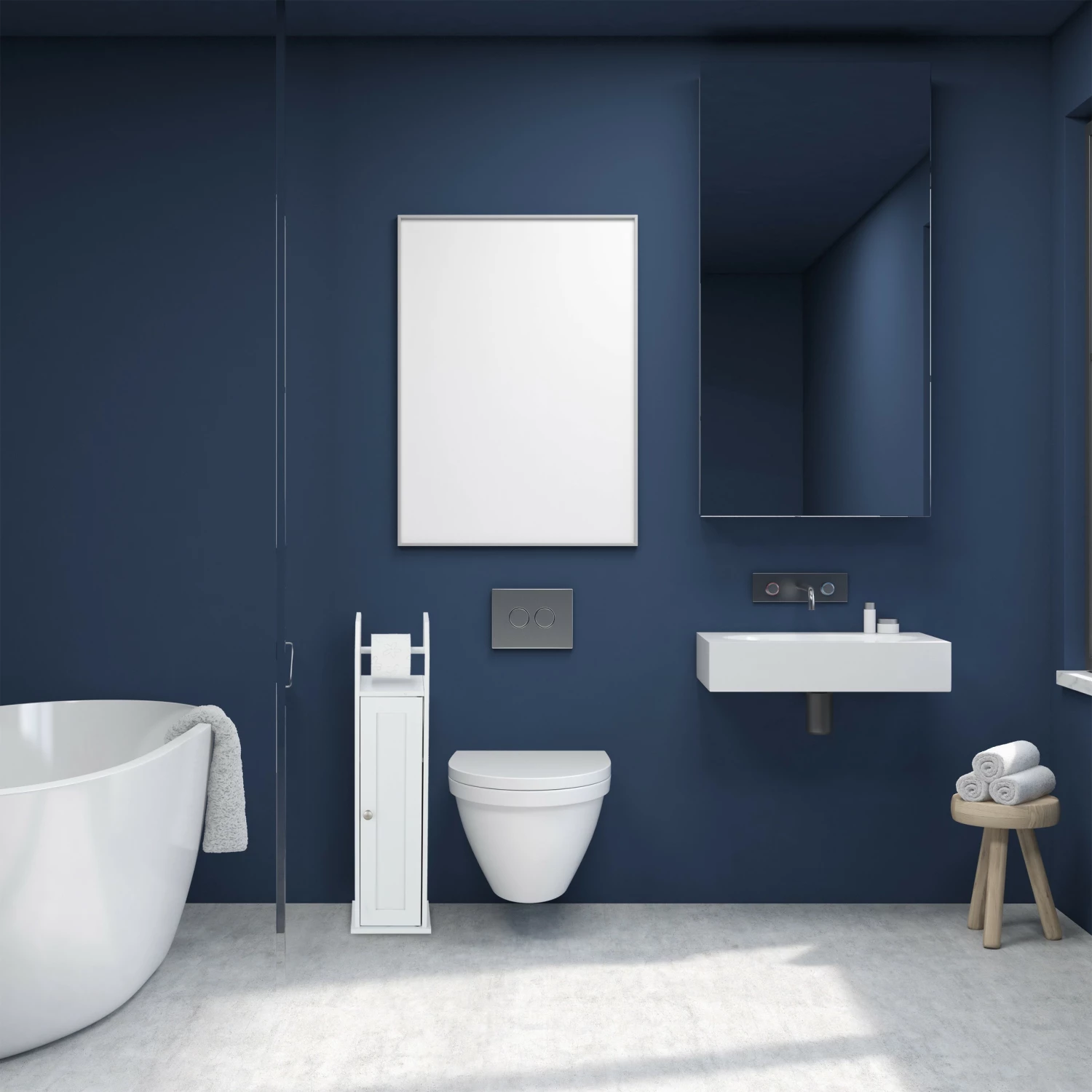Mit dem Toilettenrollenhalter sind bis zu 5 Ersatzrollen Klopapier stilvoll aufbewahrt. Zugleich ist das Toilettenpapier auf dem WC Halter stets griffbereit. Im Inneren hat der weiße Nischenschrank eine schmale Ablage, auf der Hygieneartikel verstaut werden können. In dem hohen Fach kann auch die WC Bürste mit Ständer blickdicht untergebracht werden. Ein Loch an der Seite sorgt im WC Schrank für eine gute Luftzirkulation. Dank schickem Landhaus Stil ist das Schränkchen ein Hingucker im Bad.