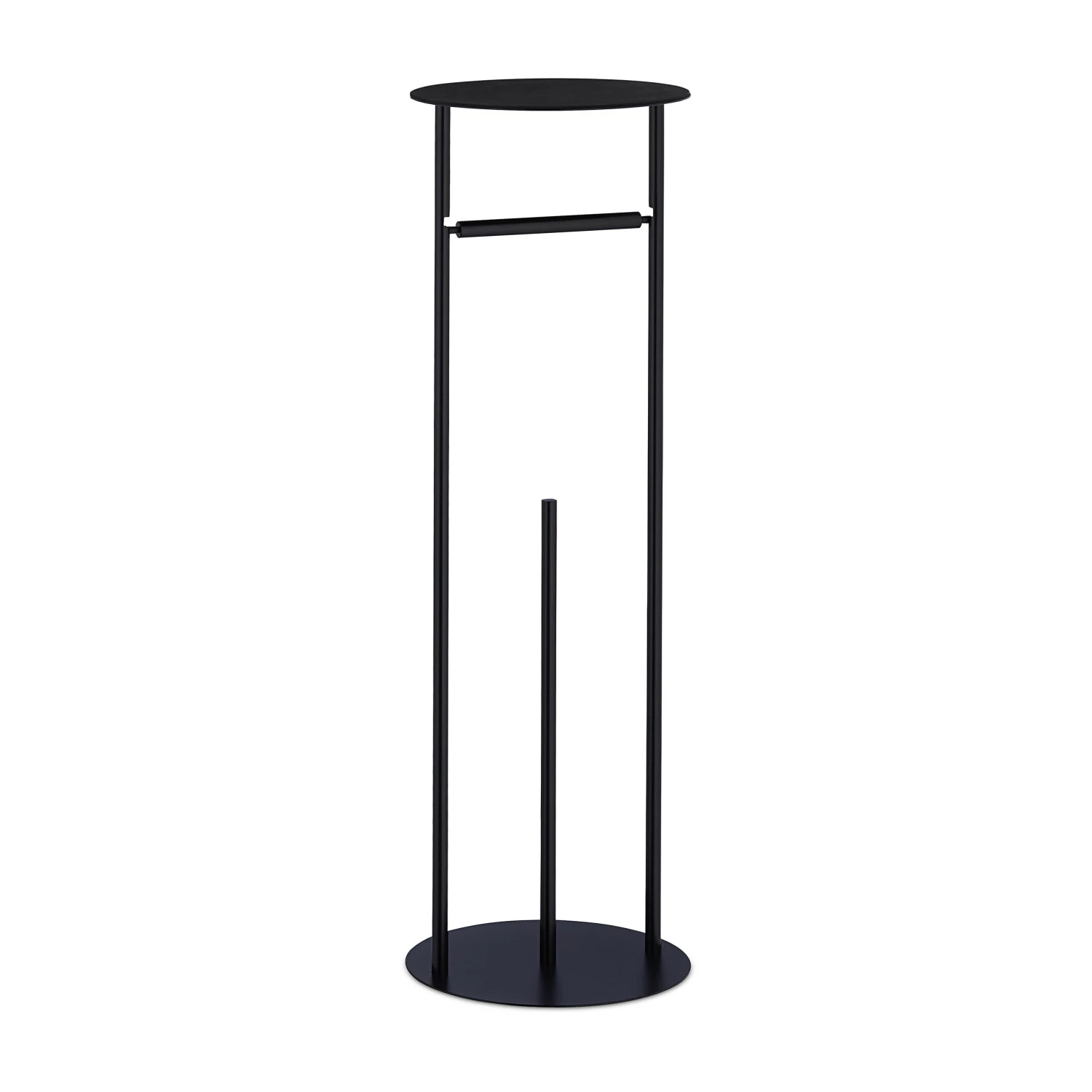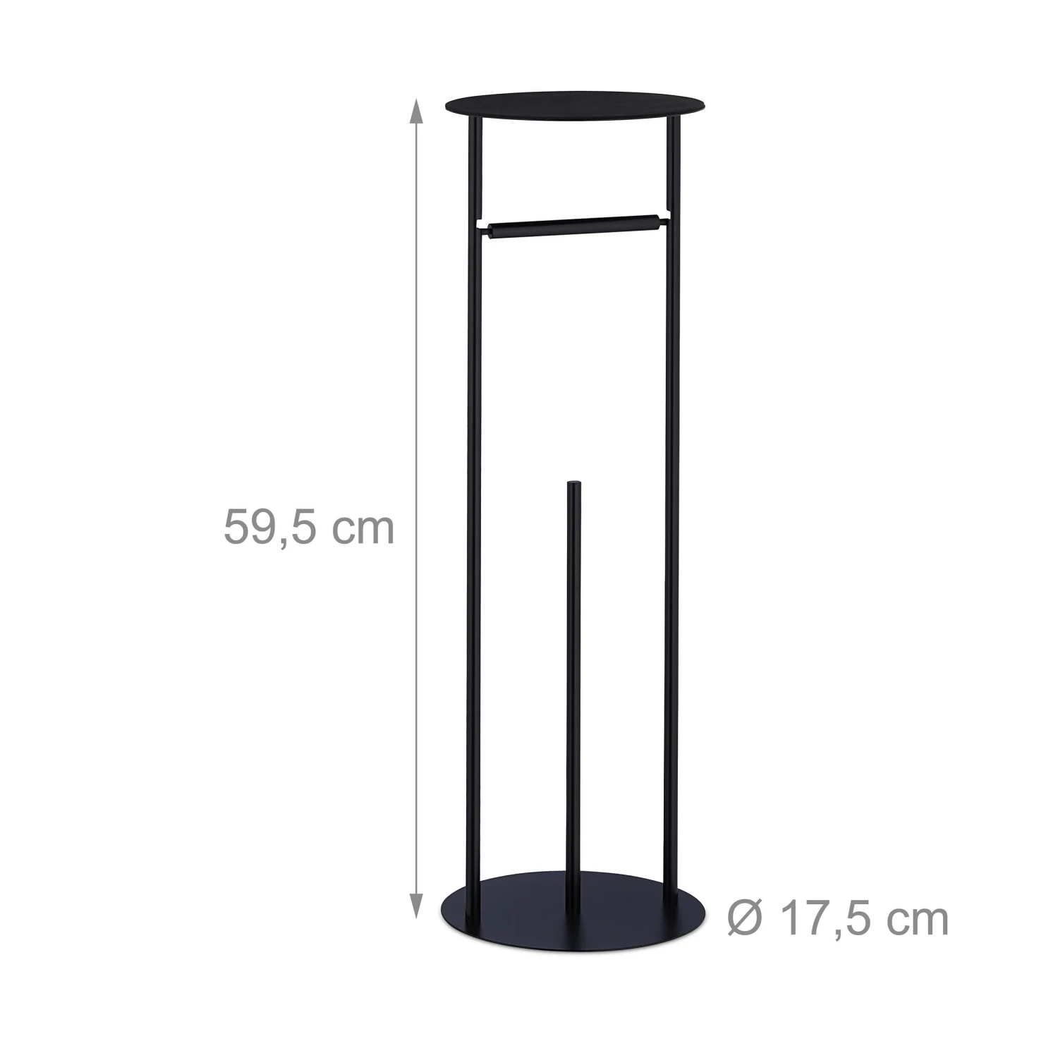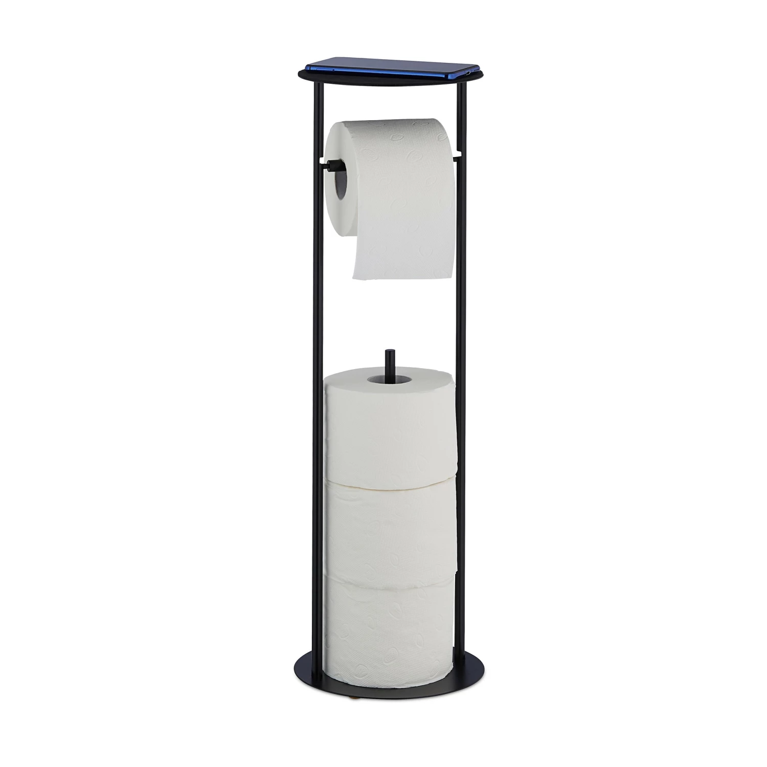 Mit diesem Toilettenpapierhalter hast Du das Toilettenpapier immer griffbereit. Handy, Feuchttücher oder die Lektüre finden auf der praktischen Ablage ihren Platz. Und auch die Toilettenpapierreserve wird gleich mit aufbewahrt. Dabei haben bis zu 3 weitere Rollen als Reserve auf der Stange Platz und der Ärger des fehlenden Toilettenpapiers auf dem WC gehört der Vergangenheit an. Das schwarze Design fügt sich zudem unkompliziert in jedes Badezimmer oder Gäste-WC ein.