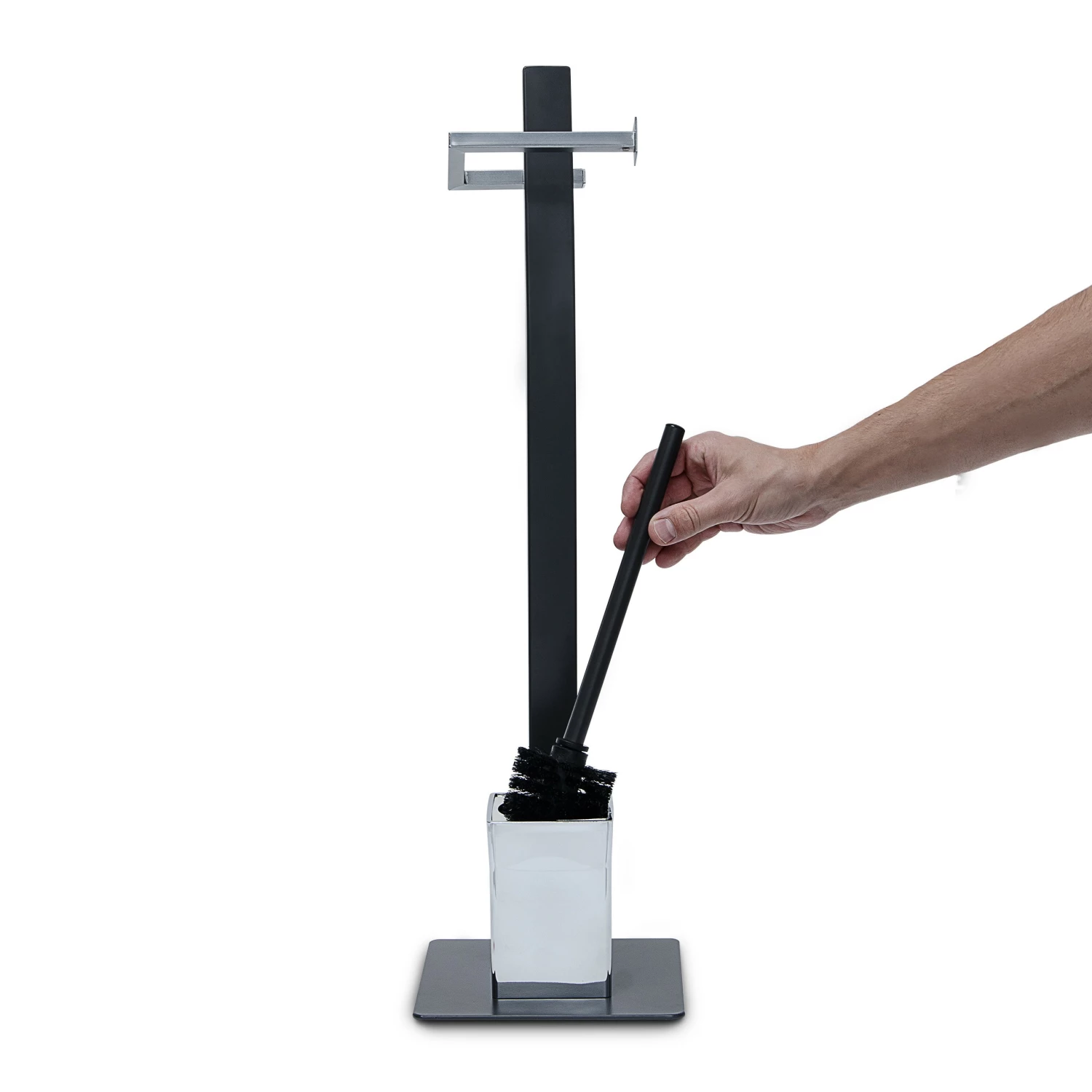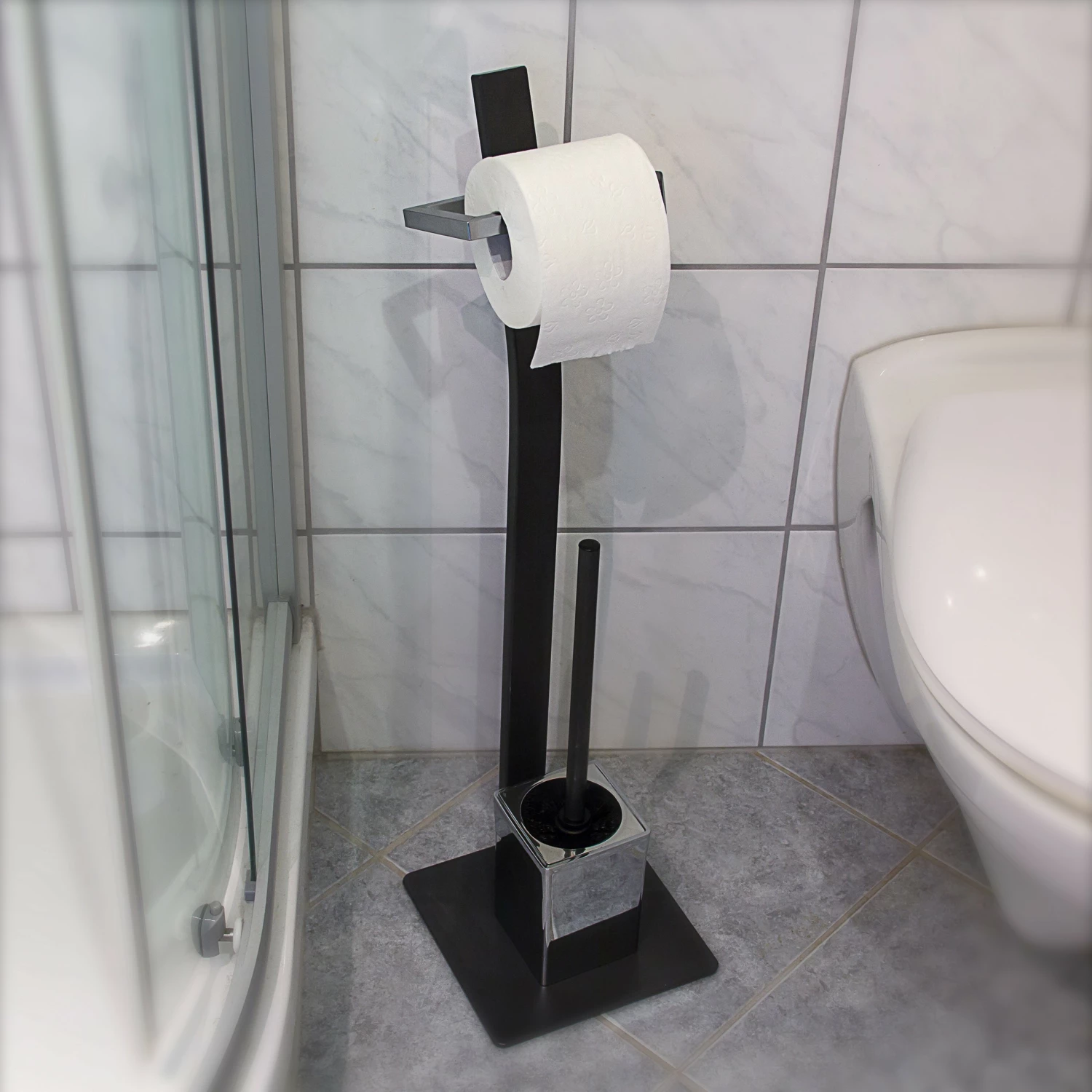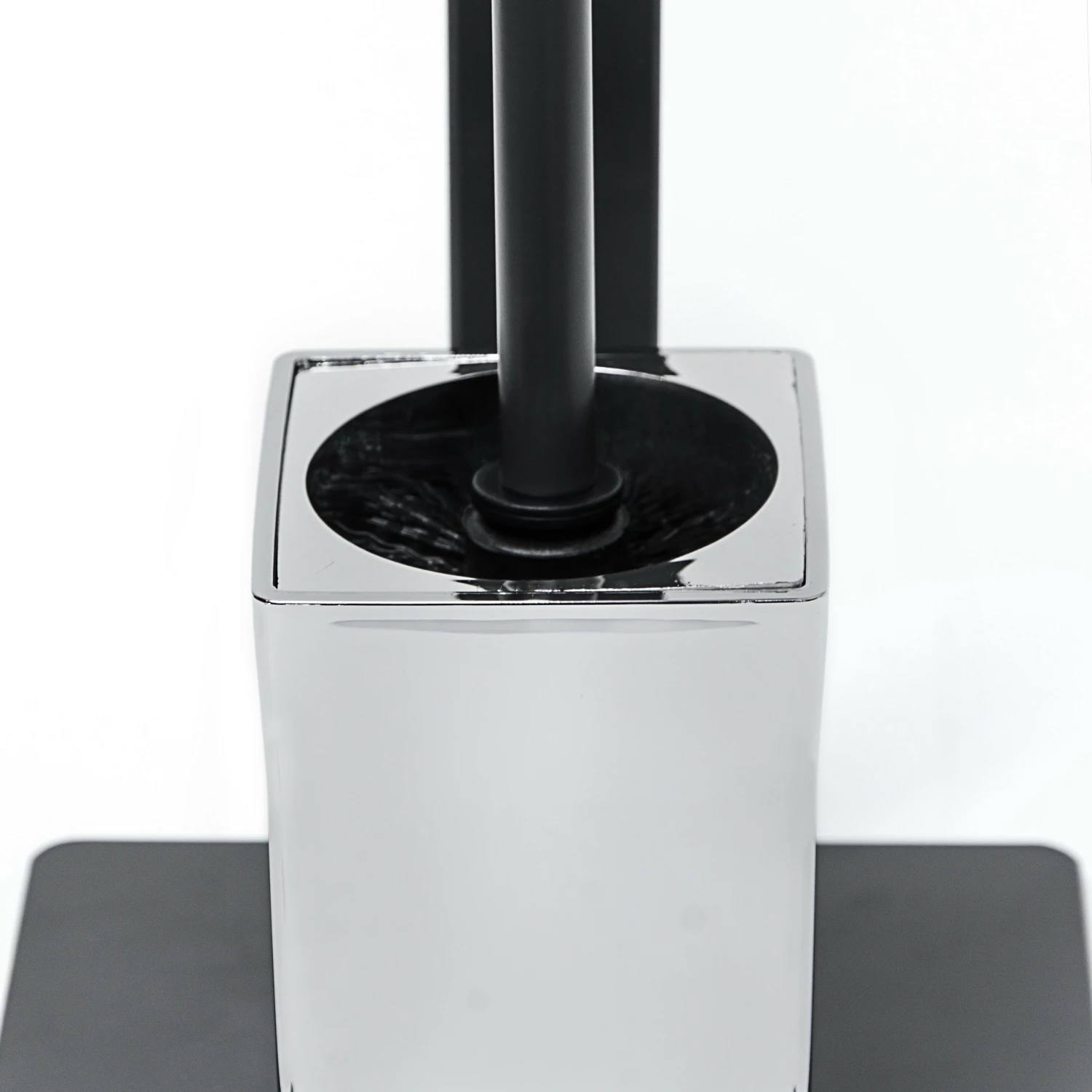 Die Toilettenbürste verfügt über einen schwarzen Kopf zum Wechseln und wird in einem herausnehmbaren Behälter aus Kunststoff gelagert. Die Reinigung der Bürstengarnitur erfolgt dadurch bequem und hygienisch. Dank der 4 Untersetzer steht die massive Bodenplatte schonend und rutschfest auf dem Untergrund.