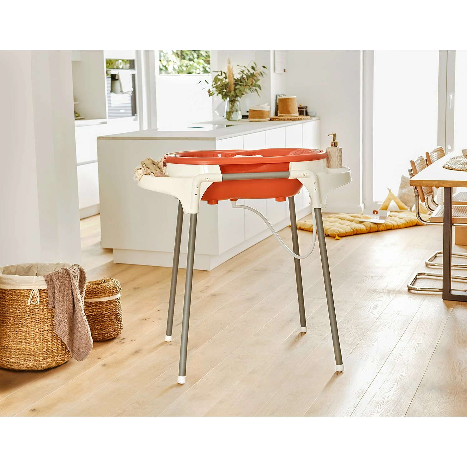 - Perfekt abgestimmte Kombination bestehend aus: Badewanne TOP, Wanneneinsatz TOP, Wannen-Funktionsständer TOP und Ablaufschlauch. Die Badewanne TOP ist nicht nur sicher und bequem, sondern ist auch anatomisch und ergonomisch geformt. Für rückenschonendes Baden lässt sich der Wannenfunktionsständer auch auf die gewünschte Höhe verstellen (98 cm – 102 cm). So ist die Badestation auch für große Eltern (über 180 cm) geeignet. Die Badewanne ist beidseitig nutzbar: Neugeborenenseite mit breitem Rand als Armauflage zum bequemen Halten des Babys und Kleinkindseite mit Anti-Rutsch-Matte für komfortables Sitzen. Inklusive integrierten Ablagen für Seife und Waschlappen sowie einem Ablaufstopfen zum einfachen Entleeren. Durch den beiliegenden Ablaufschlauch kann das Badewasser auch ohne schweres Heben entleert werden. Die Badestation bietet absolute Stabilität und Standfestigkeit, da die TOP Badewannen fest im oberen Rahmen des Funktionsständers aufliegen. Mit praktischer Handtuchhalterung. Einfacher Auf- und Abbau der Badestation. Später, wenn Ihr Baby selbstständig Sitzen kann, kann der Ständer ohne die Standfüße auf dem Boden genutzt werden und gibt der Wanne zusätzlich kipp- und rutschsicheren Halt. Besonders hochwertiges Material: Wannenständer besteht aus robustem Stahl, silber lackiert; Seitenteile aus hochwertigem Kunststoff. Der Wanneneinsatz ist ideal für die ersten Wochen: Der Einsatz hat eine anatomisch und sichere Form für das komfortable Baden von Säuglingen. Ausreichend Armfreiheit erleichtert das Halten des Babys. Den Badewanneneinsatz einfach einhängen und mit Saugnapf am Wannenboden befestigen. Vor dem Bad sollten Sie mit einem Thermometer die Wassertemperatur kontrollieren (max. 37 °C). Alters- und Gewichtsempfehlung: ab 0 Monate, max. 25 kg (inkl. Wasser). Entspricht der europäischen Norm DIN EN 17072-2019 und ihren Sicherheitsanforderungen für Badewannen, Gestelle und nicht freistehende Badehilfen.