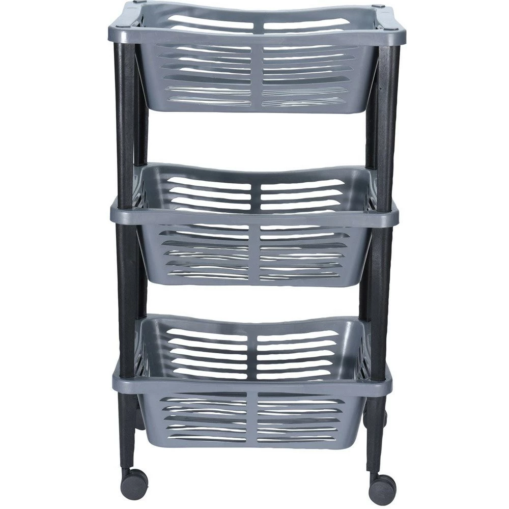 <Universal, 3-level Kutsche auf Rädern für den vielseitigen Einsatz im Haushalt. Darüber hinaus funktioniert es auch gut in einem Keller, einer Werkstatt oder Garage. Es kann sowohl in der Küche zur Aufbewahrung von Gemüse, Obst, Lebensmittelbehälter oder Utensilien als auch im Bad zur Aufbewahrung von Kosmetika und Badezubehör verwendet werden. Die faltbaren kleinen Körbe – sind ineinander versenkbar. Ausgestattet mit vier Beinen für eine einfache Bewegung an jedem Ort. Der Wagen ist stabil, leicht und bequem zu reinigen.