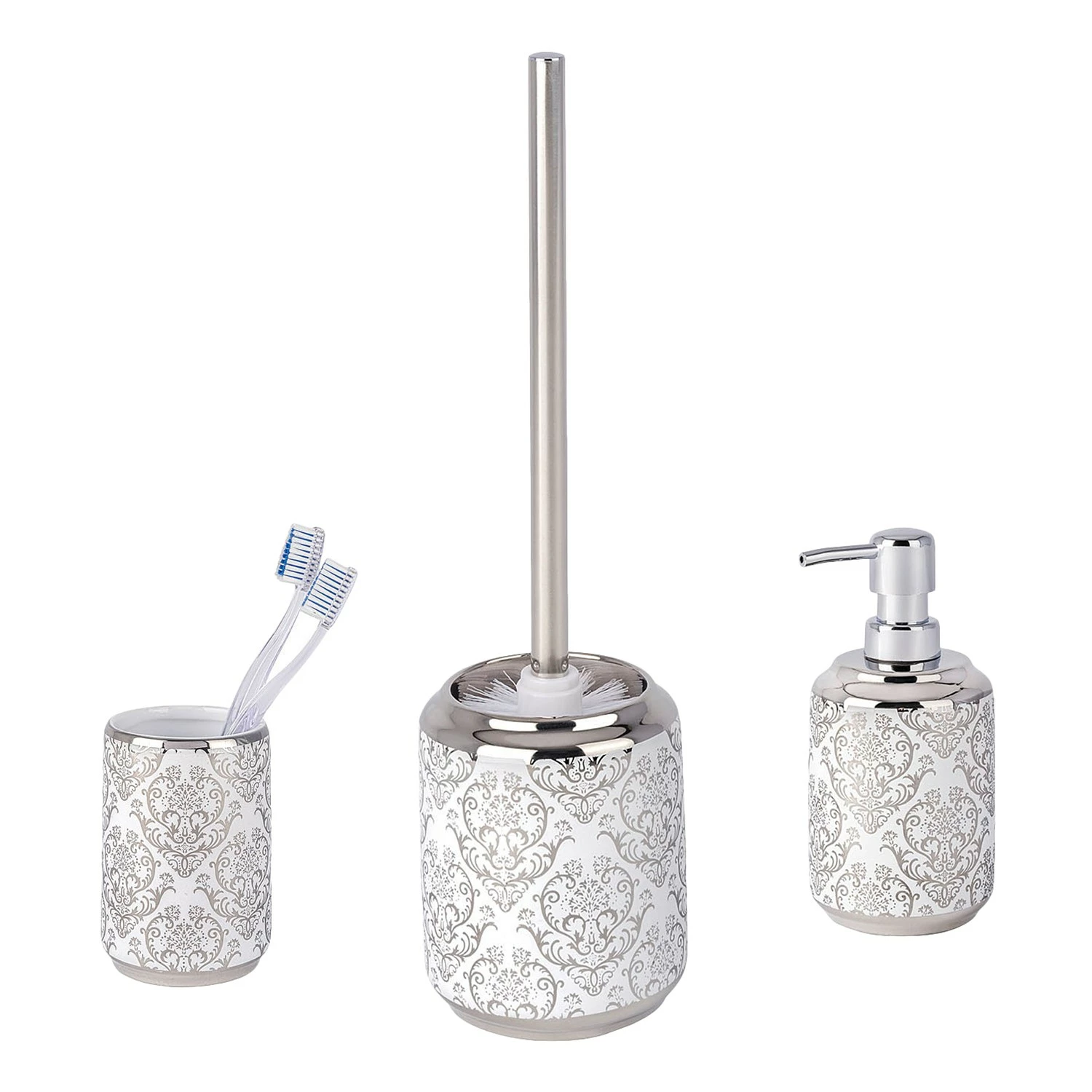 - Lieferumfang: WC-Garnitur, WC-Bürste, Seifenspender, Zahnputzbecher