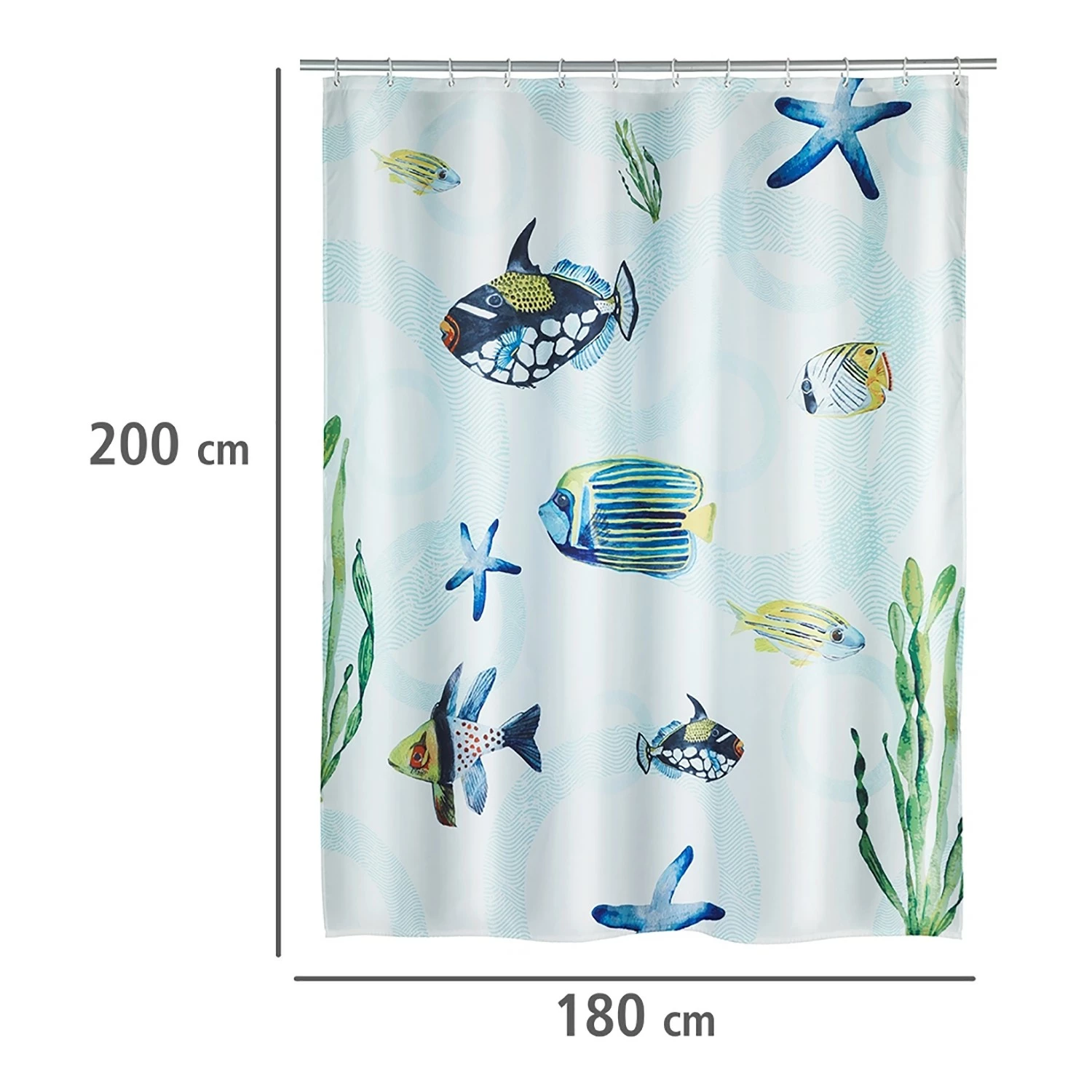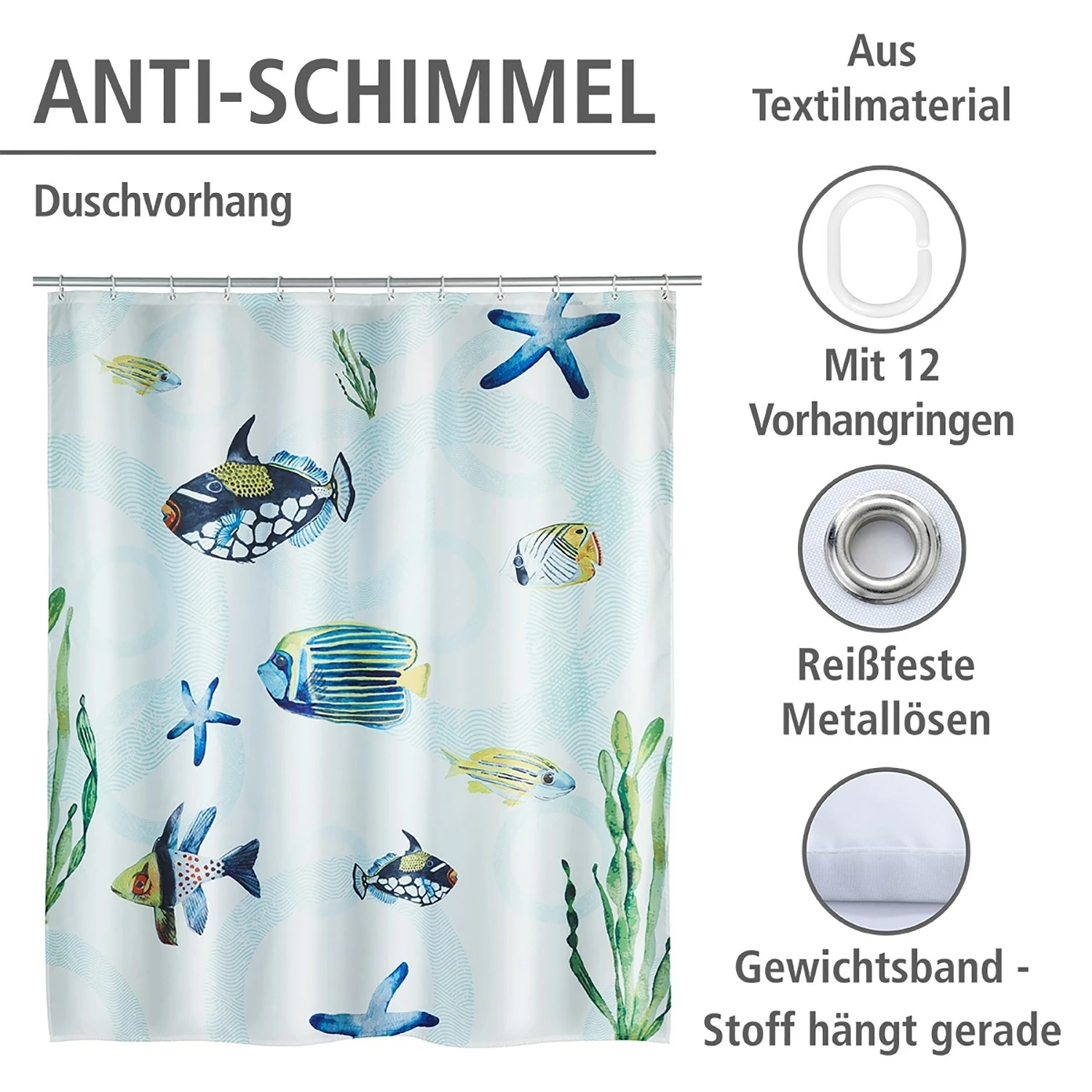 - Lieferumfang: Duschvorhang, 12 Duschvorhangringe