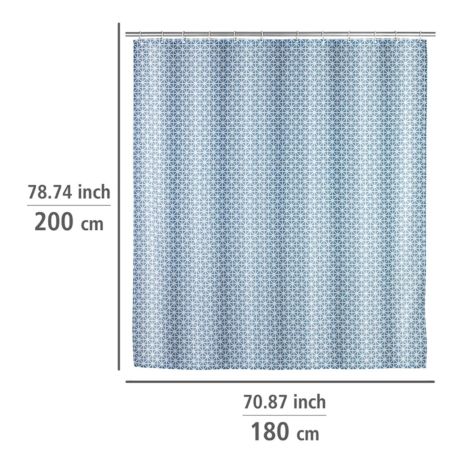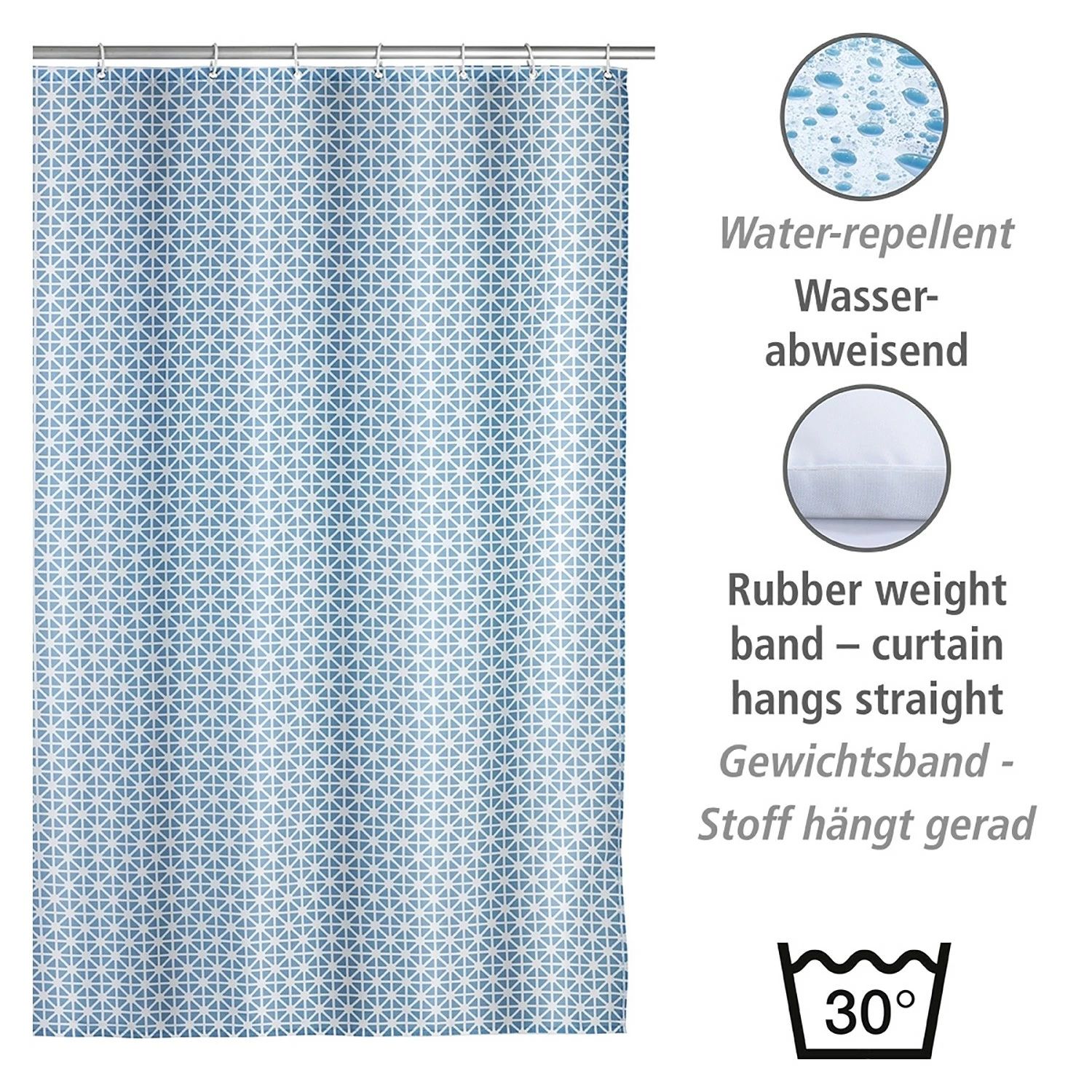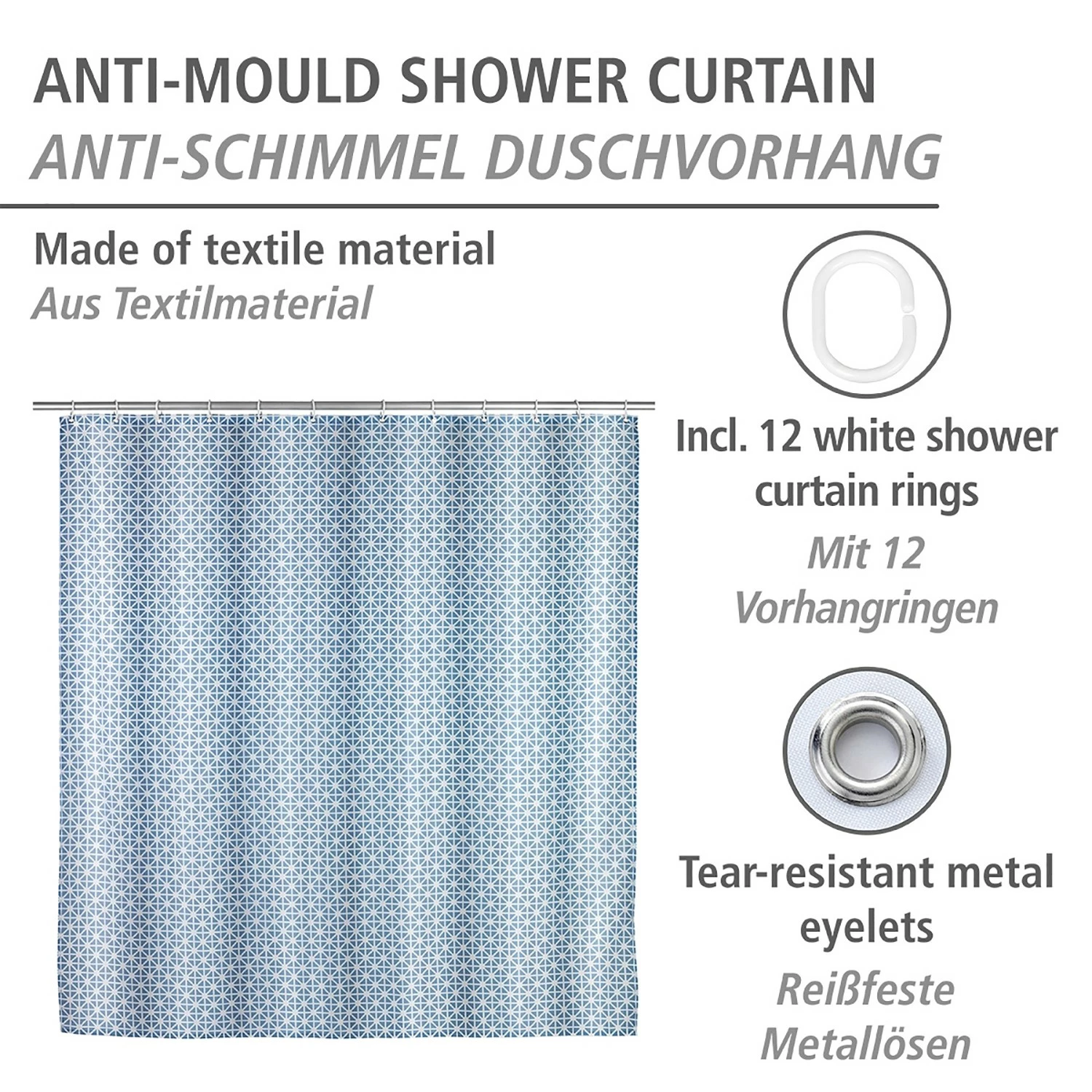- Lieferumfang: Duschvorhang, 12 Duschvorhangringe