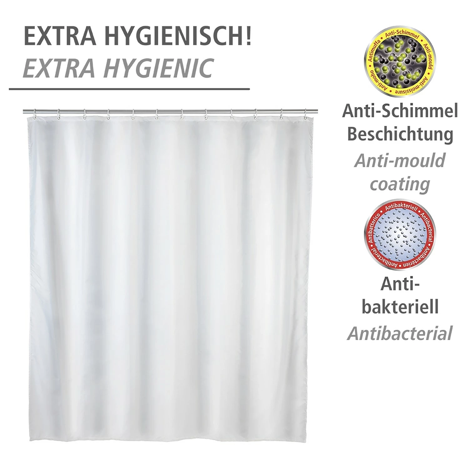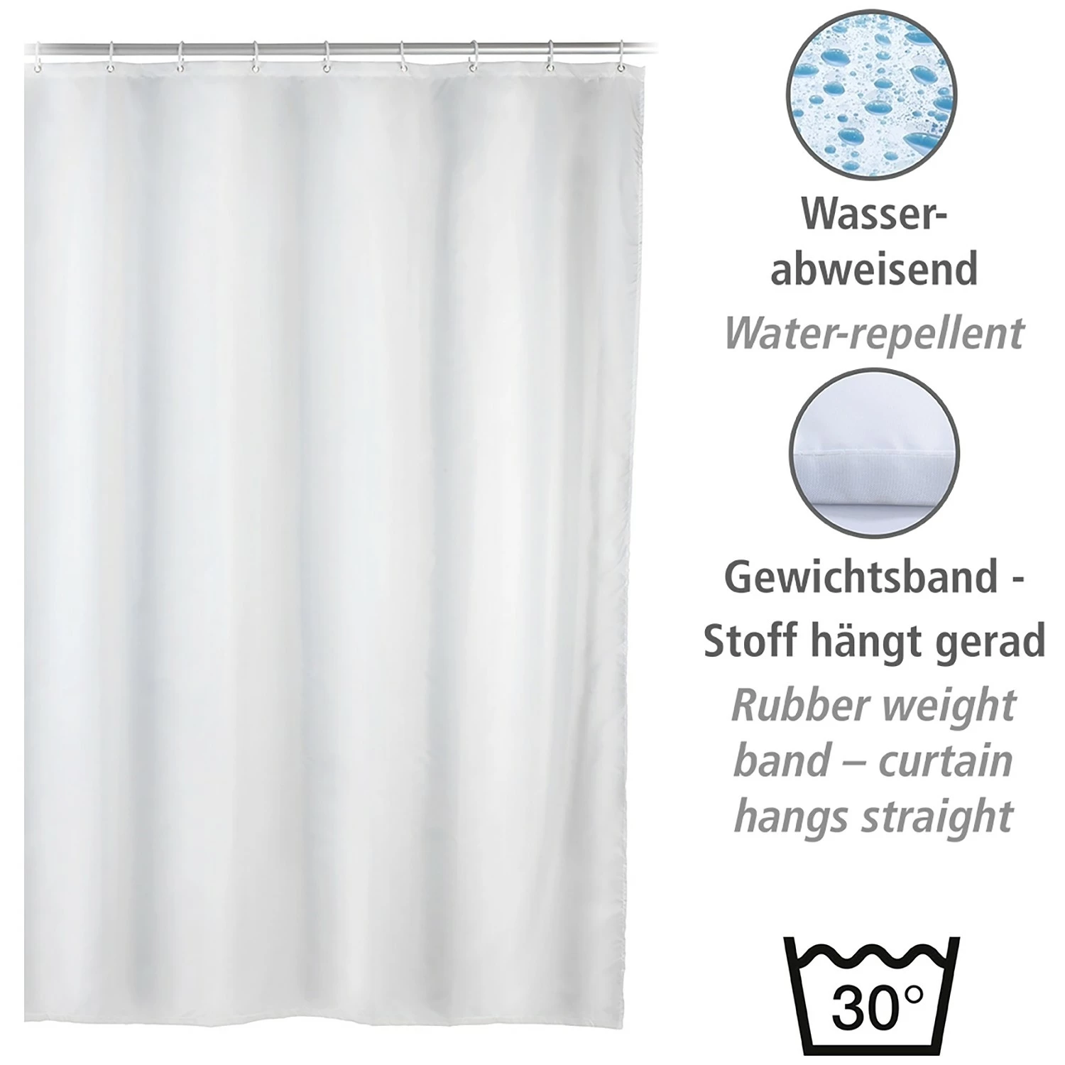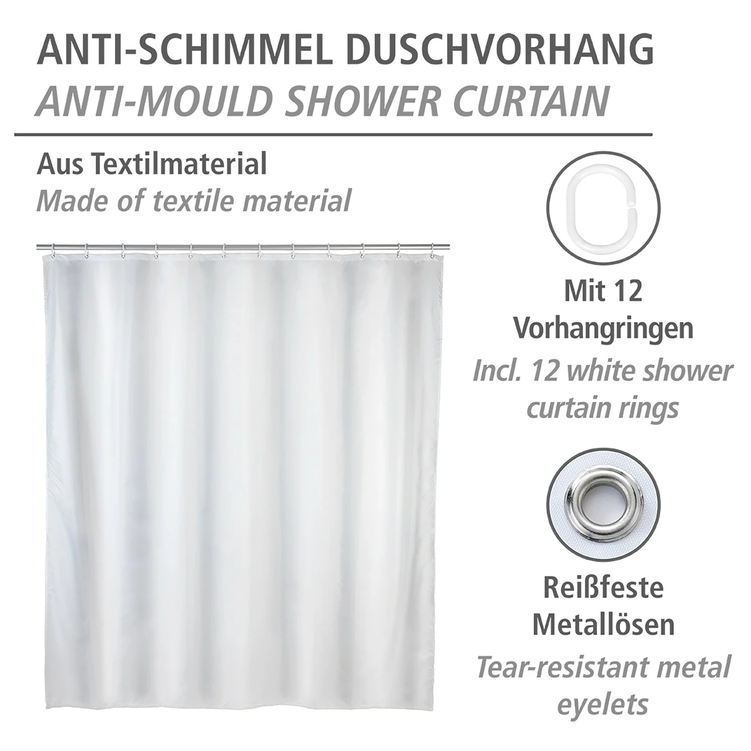 - Lieferumfang: Duschvorhang, 12 Duschvorhangringe