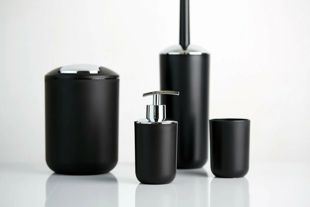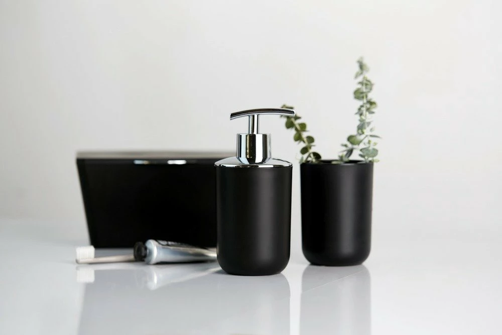 - Der weiße Behälter mit dem silbernen, einfachen Spender ist ein perfektes Paar für die Dekoration des Badezimmers.