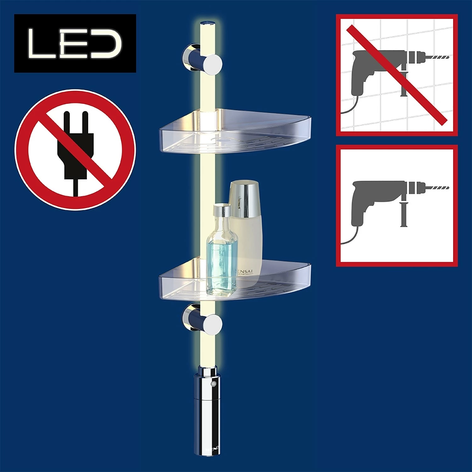 - Lieferumfang: LED Stange mit Energieinheit, 2 Ablagen, 2 verschiebbare Wandbefestigungen, USB-Kabel Power-Loc Kleber, Schrauben und Dübel