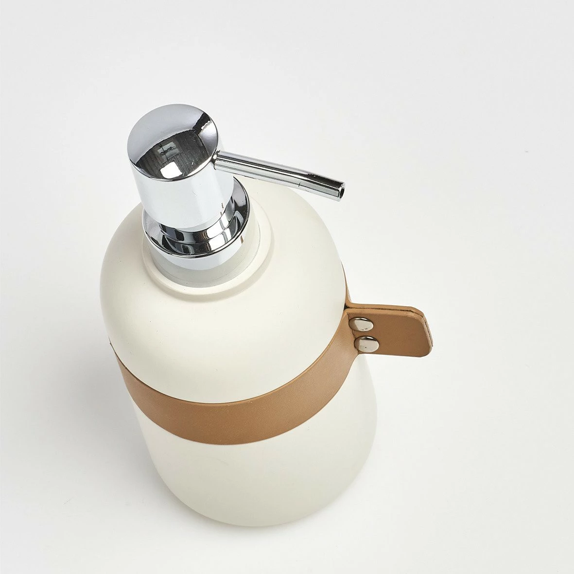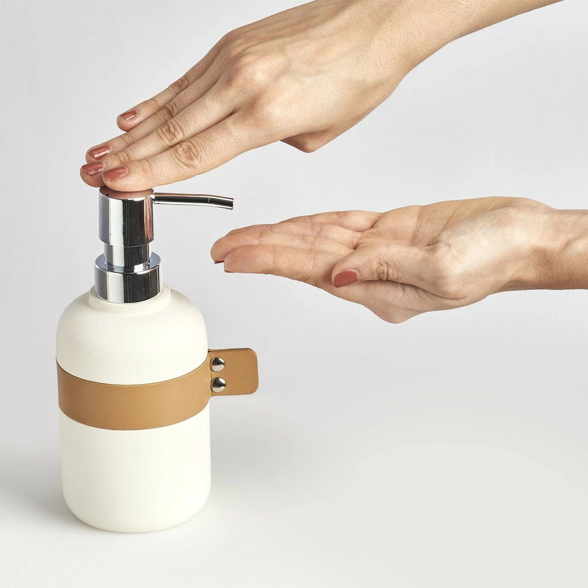 Es wird auch im Badezimmer für alle Arten von Kosmetika wie Mizellflüssigkeit, Haarshampoo oder Körpergel großartig sein, dank ihm werden Sie immer die richtige Menge an Produkt erwerben. Der Spender ist in einem einfachen Stil gehalten, mit einem klassischen Weißton, der sicherlich mit vielen Nan harmonieren wird. Das Kit besteht aus einem Behälter aus Polyresin und einem Kunstleder und praktischer Dosierpumpe.